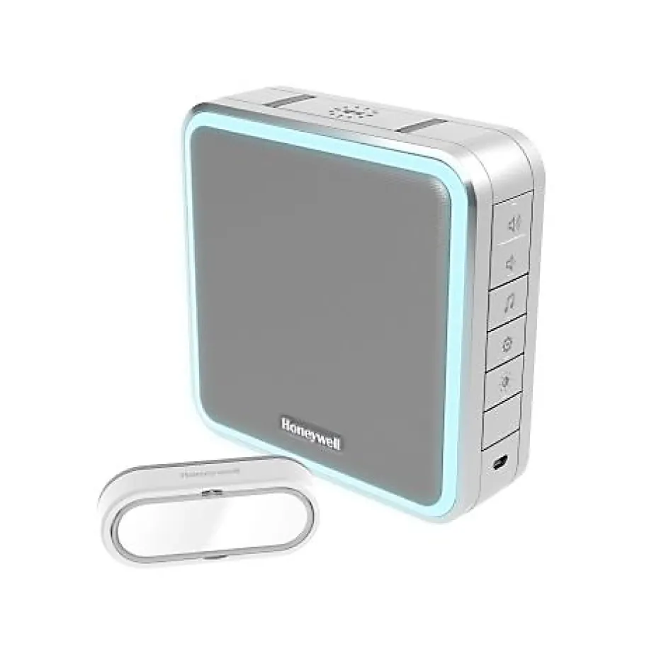 Ce kit de carillon SÉRIE 9 sans fil de la marque Honeywell offre plusieurs fonctionnalités permettant de signaler la présence d’un visiteur devant le portail. Le kit comprend un carillon sans fil mobile, un bouton-poussoir sans fil, une pile CR2032 (3 V), un livret de guide de démarrage rapide, un livret de sécurité et de garantie. Il dispose aussi d’un mode sommeil pour plus de tranquillité pendante la nuit. Ce dispositif est doté d’un halo lumineux qui prévient lorsque le carillon est inaudible. Caractéristiques techniques :Kit carillon sans fil mobile : Couleur : grisMontage mural : optionMélodies : 11Son : commande de volume / mode sommeil et silence / sirène intérieureDurée d’alarme (minutes) : 2 (mode sirène intérieure)Avertissements visuels : halo lumineux 8 couleurs / DEL clignotanteCouleurs des halos lumineux : rouge, vert, bleu, cyan, magenta, jaune, blanc,ambreAlimentation : pile : 4 x LR14 (C) 1,5 V – / (non fourni)Durée de vie de la pile : 5 ansCaractéristiques de la batterie : témoin de pile faible / logement des piles facile à ouvrirOption d’alimentation via micro USB : alimentation externe optionnelle via prise USB 5 V 500 mANombre maximum d’appareils : 6 x bouton poussoir sans fil / détecteur de mouvement sans fil / détecteur d’ouverture sans fil pour porte et fenêtreTempérature de fonctionnement / température de stockage : 0 °C à + 40 °C / – 20 °C à + 60 °CAttaches : supports / cheville rawl / visFréquence / puissance de transmission / portée sans fil : 868 MHz / 200 mPortée sonore (volume) : 100 m (90 dB)Dimensions (H x l x P) : 126 x 126 x 41,8 mmPoids : 264 g Bouton-poussoir sans fil :