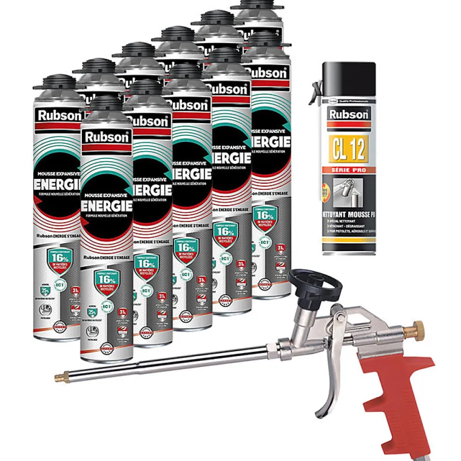 Pack Complet Rubson : 11 Mousses Expansives Énergie + 1 Nettoyant CL12 + Pistolet Fischer Darex Ce pack professionnel réunit tout le nécessaire pour des travaux d’isolation, de calfeutrement et d’entretien parfaitement maîtrisés. Il comprend 11 aérosols de mousse expansive Rubson Énergie 750 ml , 1 nettoyant Rubson CL12 500 ml pour éliminer la mousse non durcie, ainsi qu’un pistolet manuel Fischer Darex de haute qualité pour une application précise. 1. Rubson Mousse Expansive Énergie – Les avantages • Mousse nouvelle génération : impact environnemental réduit, formulation contenant au moins 16 % de matières recyclées .• Certification EC1 Plus : très faibles émissions de composants volatils.• Haute expansion : jusqu’à 31 litres par aérosol .• Séchage rapide : mousse sécable après 50–65 minutes.• Excellente adhérence : bois, pierre, béton, métal, PVC, etc.• Idéale pour isoler, combler, jointer, fixer et remplir des cavités. Mode d’utilisation de la Mousse Expansive Énergie 1. Préparation des supports : Les surfaces doivent être propres, saines, stables et exemptes de poussière ou de graisse. Elles peuvent être humides mais ne doivent pas être givrées ou glacées. Protégez les zones environnantes avec une bâche.2. Conditions d’application : • Température d’application : -5°C à +35°C.• Température idéale de l’aérosol : +5°C à +30°C.3. Agitation de l’aérosol : Secouez vigoureusement l’aérosol environ 20 fois avant utilisation.4. Application de la mousse : Fixez solidement le pistolet sur la valve et utilisez l’aérosol tête en bas pendant toute l’application pour un résultat optimal. 2. Rubson CL12 – Nettoyant pour