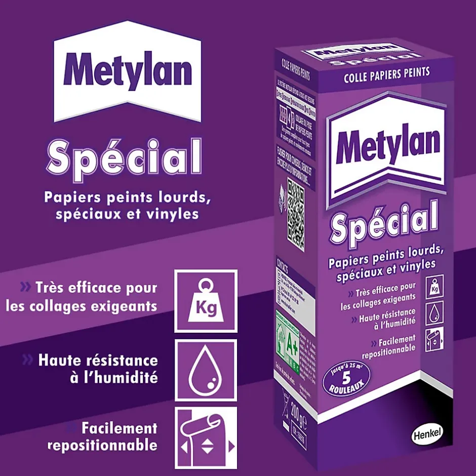 Metylan Colle Spéciale Papiers Peints Lourds, posez tous vos papiers peints lourds, spéciaux et vinyles, même les plus difficilesRapide, facile et longue durée. Rénovez votre intérieur avec la Colle Papiers Peints Spéciale de Metylan. Elle vous permettra de coller tous vos papiers peints, y compris les lourds, spéciaux et vinyles. Grâce à son traitement fongicide, elle peut être utilisée pour coller vos papiers peints dans des pièces humides comme votre cuisine ou votre salle de bain car elle évite la formation primaire de moisissures. Multi-supports, elle peut s’utiliser sur les papiers peints ingrains ou spéciaux et s’applique facilement à la brosse (papier ingrain classique) ou au rouleau (papier peint tissé) afin de parfaire votre rénovation intérieure. Sa formule spéciale assure une tenue longue durée même sous plusieurs couches de peinture et empêche le décollement des raccords après peinture, les décolorations et l’apparition d’auréoles. Assurez-vous que les surfaces à tapisser soient propres et exemptes de poussière et de saleté. Mettez la poudre dans un seau rempli de 4 litres d’eau froide et remuez jusqu’à épaississement. Laisser reposer pendant 30 minutes puis brasser énergiquement. La pâte est maintenant prête à emploi, sans grumeaux. Encoller les lés avec une brosse puis positionner les lés au mur et maroufler immédiatement.Les caractéristiques du produit en détail : Colle pour papiers peints lourds, spéciaux et vinyles, Idéale pour pièces humides (cuisines et salles de bain), Mélangeable sans grumeaux, prêt à l’emploi en 30 minutes, Adhérence longue durée même sous de multiples couches de peinture, Prévient le décollement des raccords après peinture, Application à la brosse ou au rouleau, Convient sur supports alcalins, Ne décolore pas, ne provoque pas d’auréoles, Formule de metylcellulose de haute qualité.