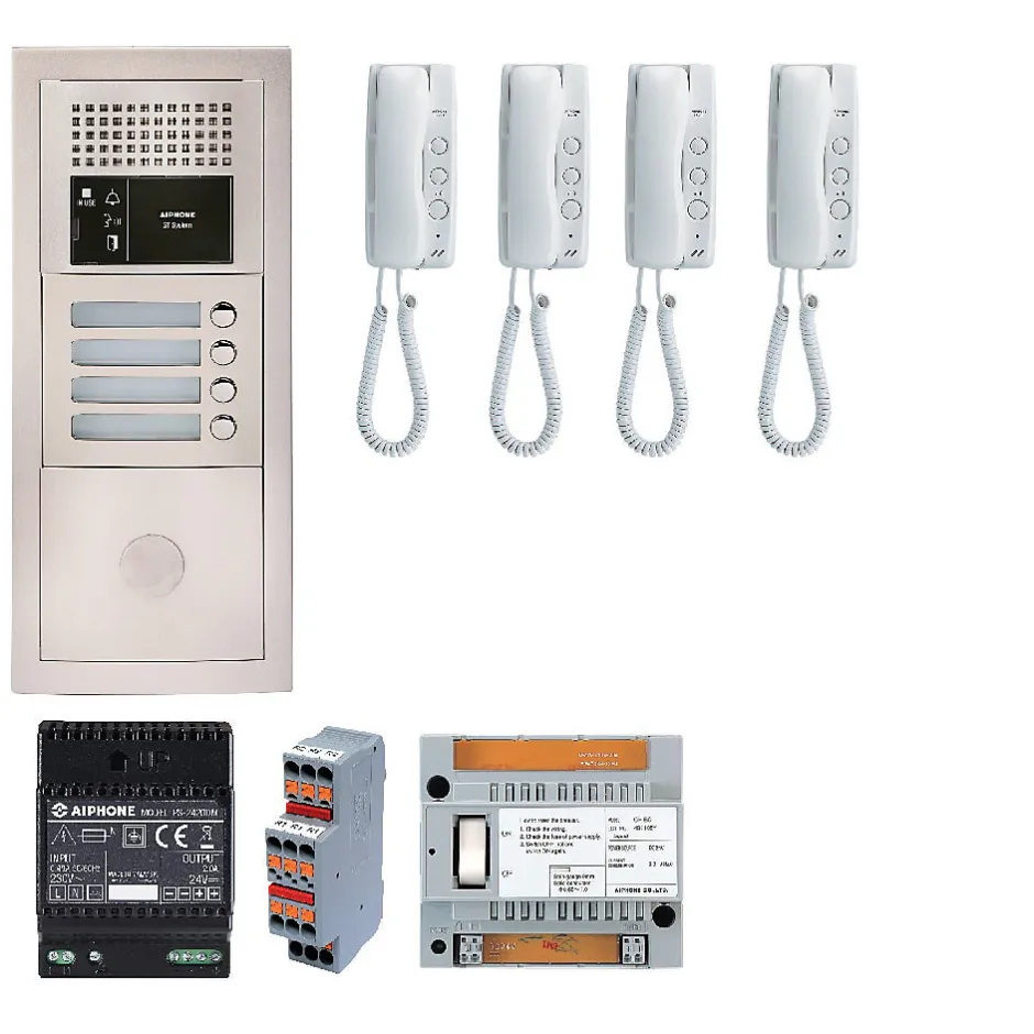 Pack interphone audio 4 BP avec 4 postes GT1D programmés – AIP/GTBA4E – AIPHONELe Pack audio 4 BP (AIP/GTBA4E) d’AIPHONE gère l’accès à un immeuble. Inclus : platine 4 boutons, 4 postes audio GT1D, centrale bus GTBC, distributeur GFC, alimentation PS2420DM.Platine audio 4 boutons d’appel à encastrerLa Platine audio à l’entrée du bâtiment a 4 boutons d’appel pour communiquer avec les occupants. Les porte-étiquettes facilitent l’identification. Micro HP GTDBV intégré pour un son de qualité. Façade pré-percée pour lecteur VIGIK, avec obturateur inclus. Design encastré discret.Quatre postes audio combiné GT1D programmésLe pack inclut 4 postes audio GT1D pour une communication bidirectionnelle confidentielle. Commandes pour déverrouillage et éclairage. Boucle magnétique pour accessibilité. Personnalisation de la sonnerie pour une expérience sur mesure.Centrale bus audio GTBCLa centrale GTBC assure la communication entre la platine et les postes audio. Elle offre un voyant vert pour vérification rapide de l’état du système. Un interrupteur permet de le mettre hors service si nécessaire. Adaptée aux copropriétés et immeubles, elle supporte jusqu’à 48 postes audio avec un câblage à deux fils non polarisés.Distributeur de bus GFCLe distributeur GFC répartit les signaux audio de la platine vers les postes intérieurs. Il offre 2 entrées et 2 x 5 sorties pour une grande flexibilité. Son installation est facile grâce à sa fixation sur un rail DIN 1 module. Compatible avec votre système existant.Alimentation PS2420DML’alimentation PS2420DM d’AIPHONE fournit une tension stable de 24 V CC à tous les composants du système. Sa technologie de découpage garantit une conversion d’énergie efficace. Compacte (93x69x66 mm), elle s’installe facilement par vis ou sur rail DIN, prenant l’espace de 4 modules.Livré avec :1 platine audio 4 boutons d’appel à encastrer4 postes audio combiné avec boucle magnétique programmés GT1D1 centrale bus audio GTBC1 distributeur de bus GFC1 alimentation PS24