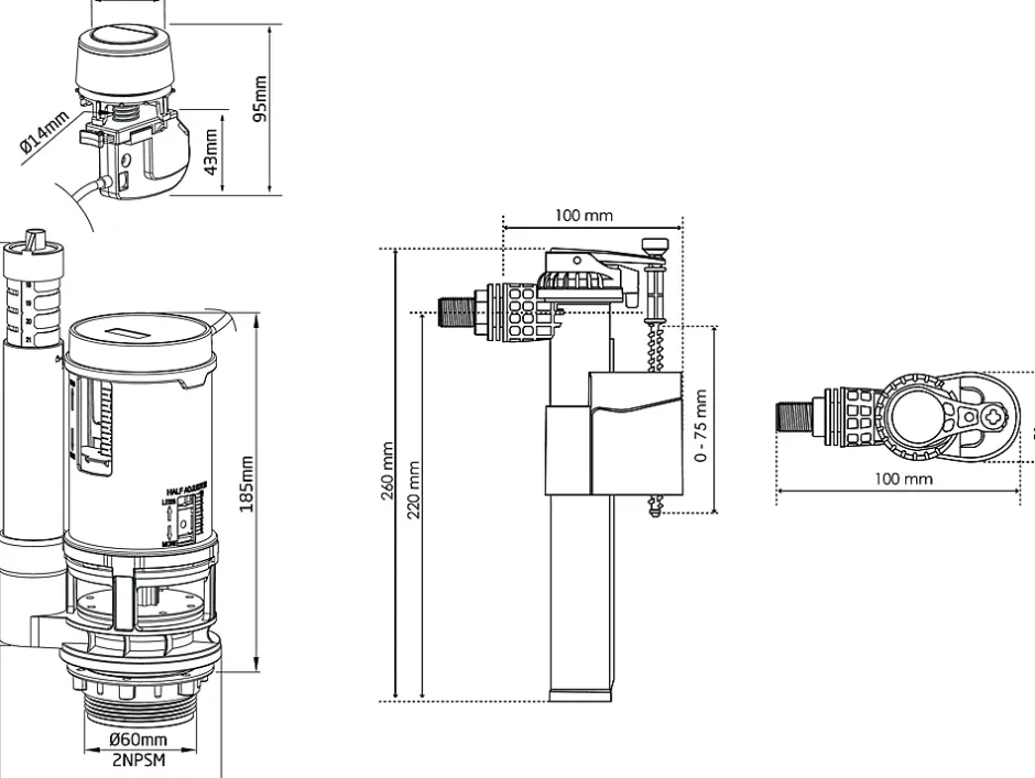 - Mécanisme à câble de vidage de chasse d’eau. Double commande auto-réglable 3/6 litres. Robinet floteur pour réservoirs de chasse d’eau à alimentation latérale.