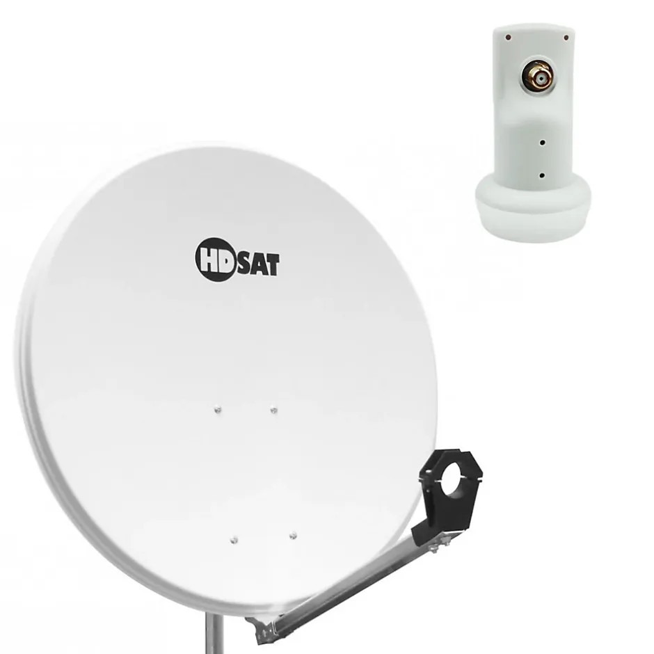 Montage rapide avec cavalier – Portefeed avec vis premonté- Parabole satellite de type offset réalisées par un procédé d’estampage de haute précision qui assure une qualité de production constante.- Réflecteur en tôle d’acier pre-zingué- Parabole fournie avec un support de fixation Az/El avec l’indicateur de l’angle de hausse imprimé sur le support.Diamètre: 80 cmMatériaux: Acier pré-zinguéMonture arrière en métalFixation sur mât: diamètre 30 à 60 mmGain à 12,625 Ghz: 38,8 dBElévation maximum: 15 à 60° LNB SINGLE HDSAT HD101Marque: HDSATModèle: HD101Type: LNB Single 1 Sortie UniverselFréquence: 10.7 – 12.75 GHzTYP: 0,1dBGain Max: 65dBCache de protection pour les Fiches FConnectiques Gold