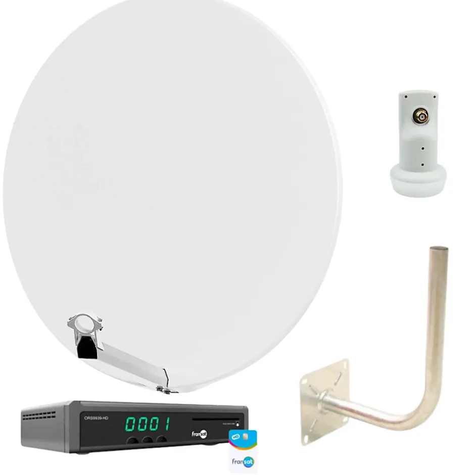 Ce pack comprend:- 1x HDSAT Parabole satellite fibre composite Blanche 85cm + BRIDES INOX Anti Corrosion- 1x HDSAT HD101 LNB Single Tête Parabole Universelle Full HD 4K Gain 65dB- 1x OPTEX ORS9939HD Récepteur / Décodeur TV Satellite HD enregistreur USB + Carte Fransat PC7 (Satellite Eutelsat)- 1x HDSAT BRAS COUDE Déport 30cm Diamètre 40mm Fixation parabole support mural Acier GalvaDescription Parabole:Cette parabole permet la réception des chaînes du satellite de votre choix. Son matériau en résine polyester renforcée en font une antenne des plus robuste du marché.Peu encombrante et facile d’installationType de parabole : OffsetMatière : Résine polyester renforcée fibre de verreDiamètre de fixation : 40 à 60 mmDimensions : 850 x 780 mmRendement: 70%Gain: 36,4 dB à 11,8 GHzAngle Offset: 23°Angle d’ouverture: 2,9°Livré sans tête LNBLivré avec notice de montageBrides et visserie INOXMatériau composite anti-corrosion, résistant aux UV, aux chocs physiques et aux variations thermiques.Fabriquée en FRANCEDescription LNB:LNB Single UniverselFacteur de bruit: 0,1 dBGain 65 dBCompatible Full HD 4KEntrée: 10.7 à 11.7 HGz / 11.7 à 12.75 GHzLO: 9.75 GHz / 10.6 GHzSortie: 950-1950 MHz / 1100 – 2150 MHzPlage de température: -40° – 60°Diamètre: 40 mmDescription Récepteur:Ce décodeur FRANSAT HD permet de réceptionner les chaînes prévues dans le bouquet FRANSAT en simple et haute définition sur le satellite Eutelsat 5°Ouest. Vous pouvez également réceptionner FRANCE 3 de la région de votre choix.<div class= »content-tabs