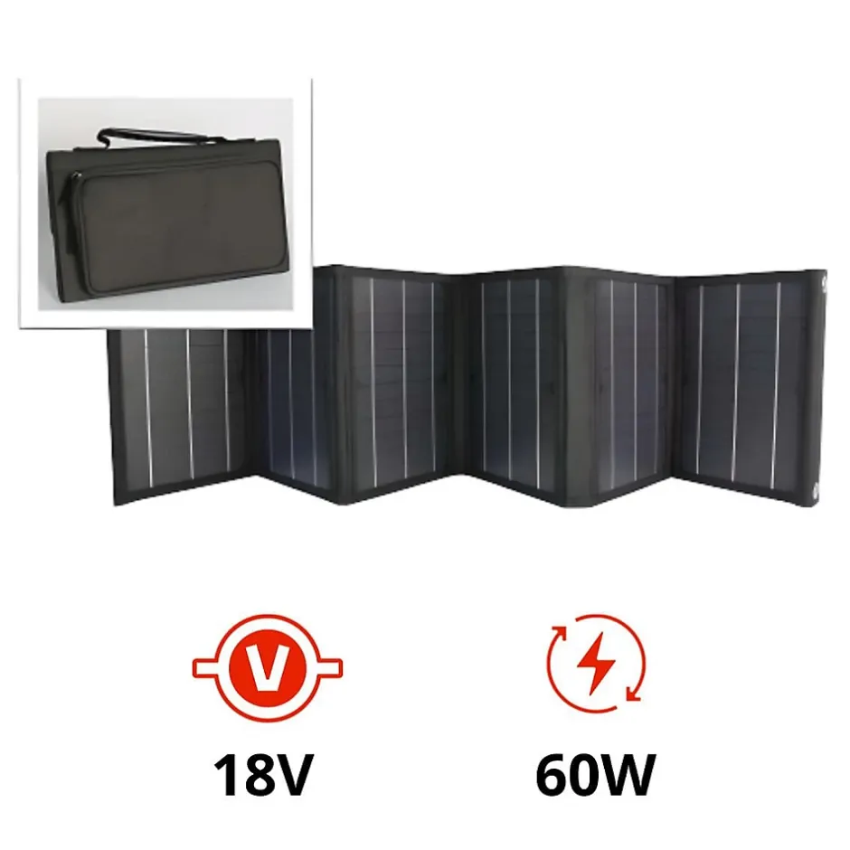 Caractéristiques : Type de produit : Panneau solaire, Marque : Protec, Gamme : SolarTec 60, Couleur : Noir, Puissance nominale : 60W ± 5%, Courant de court-circuit : 3.7A ± 5%, Tension en circuit ouvert : 21.6 ± 5%, Courant au point de puissance max : 3.3A ± 5%, Tension au point de puissance max : 18V ± 5%, Rendement : 21.8%, Sortie 18V / 3.3A, Câble de recharge 1.5m, Taille (déplié) : 127 x 35,2 x 2,5 cm, Poids : 2.2kg, Structure en 5 couches : transmission élevée et forte résistance aux intempéries, Temps de charge de la station Advance 650 : 11h max, Pliant 6 pans monocristallins, Inclus : 1 port USB-A 15W / 1 port USB-C 18W / 1 câble DC 7909, Sacoche de transport inclue, Norme : CE, Granatie : 2 ans.