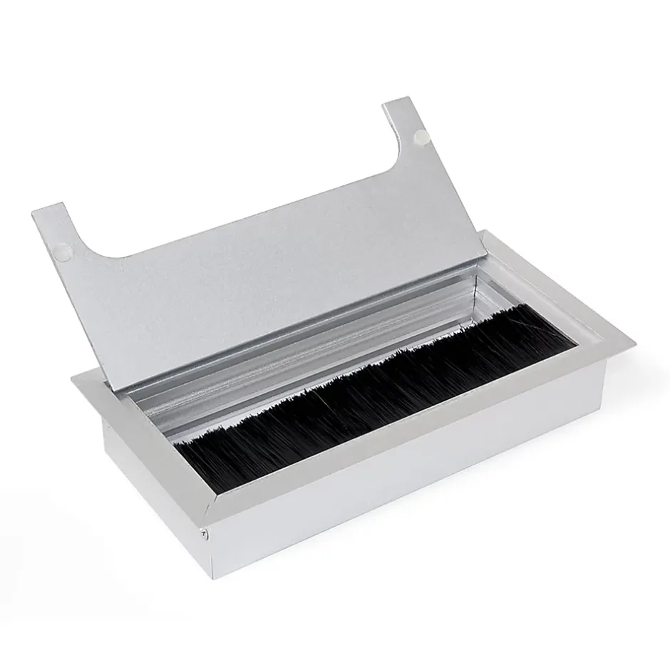 Passe-câbles rectangulaire à insérer dans la surface des bureaux, tables ou meubles de maison pour cacher les câbles des appareils électroniques.Il permet de faire passer des câbles de toute épaisseur et de cacher leurs connexions. Pour y accéder, il dispose d’un couvercle abattant et de brins en plastique noir.Pour son installation, il nécessite un usinage préalable de 147 x 68 mm. La fixation s’effectue par pression.Peut être monté sur des surfaces très épaisses.Fabriqué en aluminium anodisé mat. VOIR LES MESURES DU PRODUIT DANS LES IMAGES. Passe-câbles rectangulaire pour encastrer sur les bureaux ou les tables de travail fabriqué en aluminium. Il est compatible avec les câbles de toutes dimensions et dissimule leurs connexions facilement grâce à son couvercle rabattable.