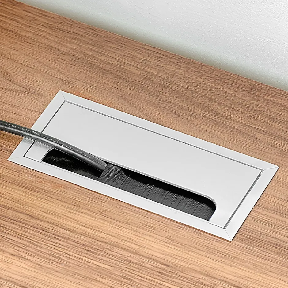 - Entrée en forme ovale allongée doublée d’une brosse noire pour protéger et organiser les câbles