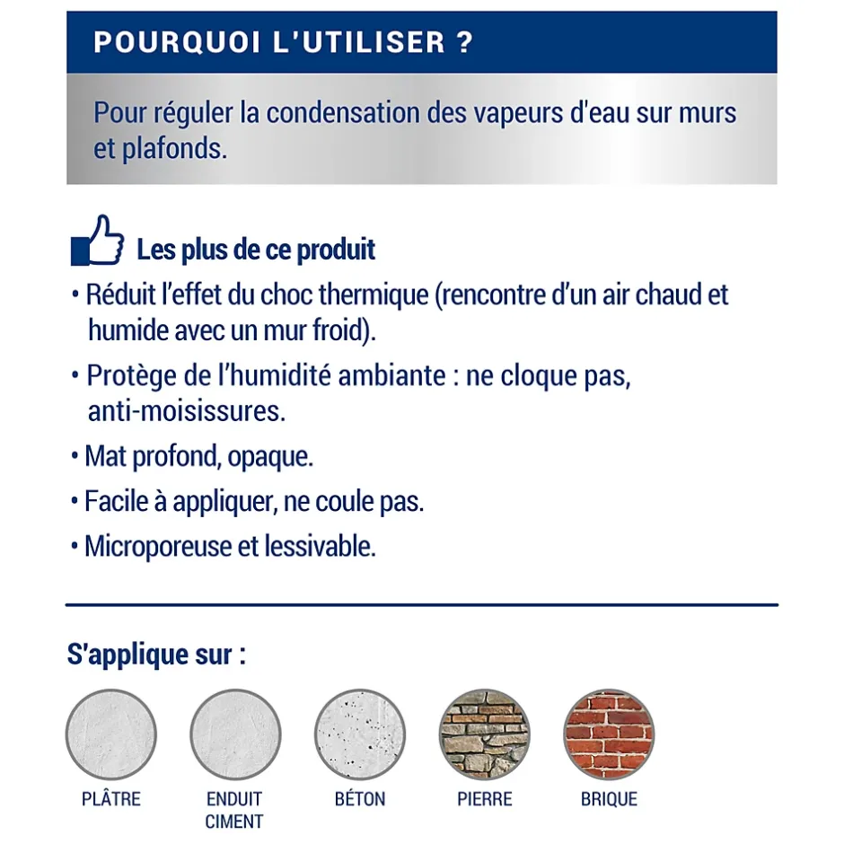 Résiste à l’humidité ambiante, ne s’écaille pas et empêche le développement de moisissures. Lessivable et microporeuse.Empêche la condensation des vapeurs d’eau chaudes sur murs et plafonds, en réduisant l’effet du choc thermique