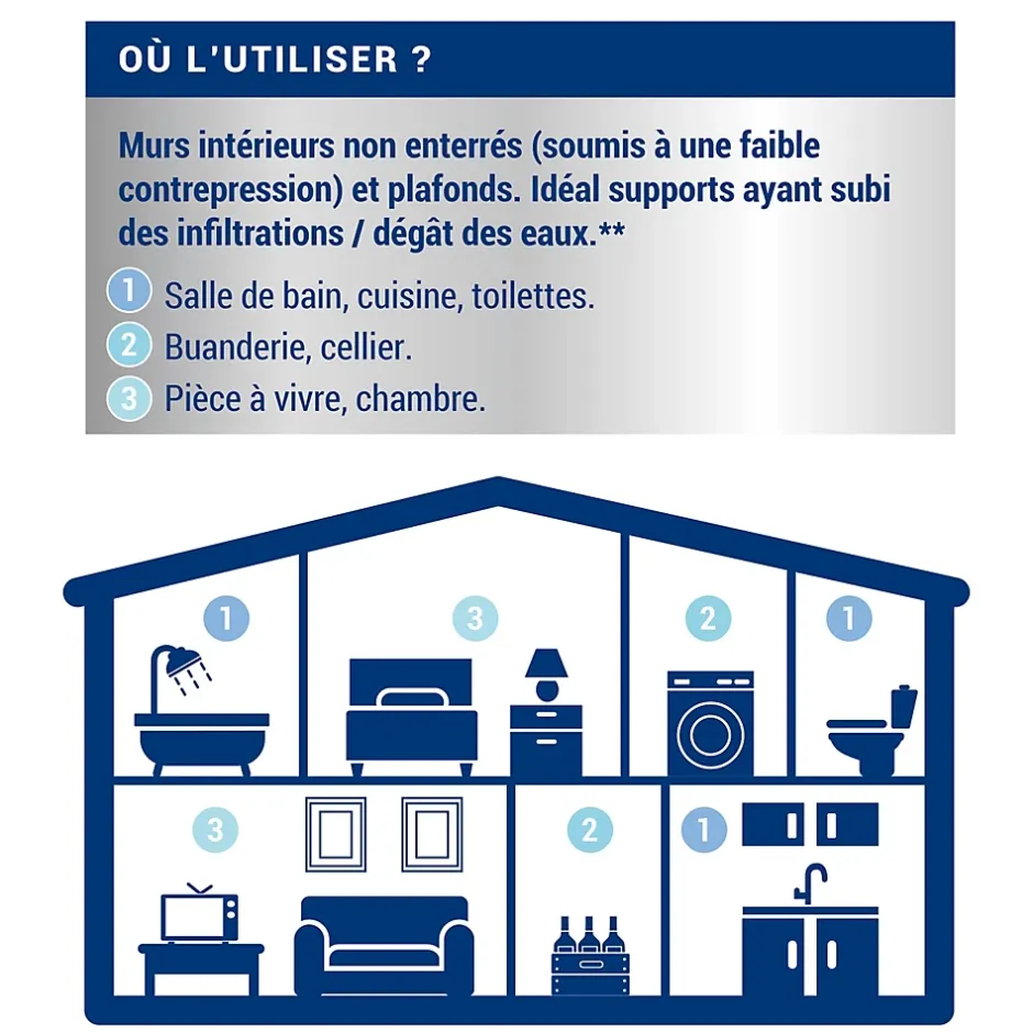 S’applique directement sur support humide. Protège des moisissures, des infiltrations et de l’humidité intérieure. Microporeuse et lessivable. Rénove les pièces avec problème d’humidité (suite dégâts des eaux, infiltration d’eau, humidité ambiante).