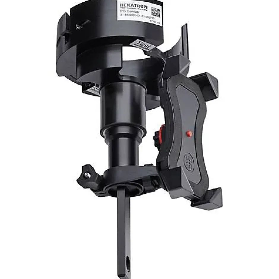 Testeur Hekatron Genius pour le montage, le démontage, le test de fonctionnement et l’entretien des détecteurs de fumée Genius de toutes générations, avec support smartphone et options de fixation multiples.