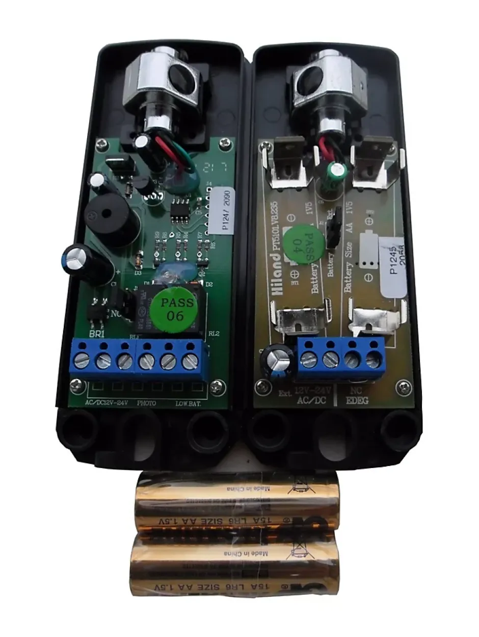 Photocellule sans fil d’automatisme sur piles d’automatisme de portailPhotocellules sans fil pour automatisme de portail ou de garage avec tête orientable. La partie électronique et placer sur partie pivotante permettant de régler l’oeil de la caméra selon sont besoin. Possibilité de connecter la cellule émettrice sur 2 piles 1.5V 15AA classique (non fournie).Très pratique la cellule émettrice peut fonctionner sur batterie permettant d’éviter de tirer un fil entre pilier.Cette paire de photocellule sans fil permet de raccorder la cellule réceptrice classiquement sur alimentation direct en 12 ou 24V à tout moment si besoin également.A quoi sert une paire de photocellule sur son automatisme de portail?C’est simple ceci permet de protéger le portail lors de la phase de fermeture afin de faire réouvrir le portail si obstacle et détecté pendant la phase de fermeture du portail. cett paire de cellule se connecte sur votre carte d’automatisme. S’installe sur tout type d’installation (sauf système bus en 2 fils), accepte une tension d’alimentation de 12 à 24V AC/DC.Photocellule sans fil infrarouge compatible avec tous les automatismes.Cette photocellule sans fil d’automatisme portail avec tête orientable à 180° disponible sur les 2 cellules réceptrice et émettrice permet de l’installer même sur des emplacements compliqués.Desyn très discret et sobre.Dimensions:127mm x 50mm, Epais: 28mmTempérature defonctionnement: -20° à +60°CEtanchéité: IP54Contact disponible: COM, NO,NCPortée max autorisé 12MCellule certifiée norme CE EN12978