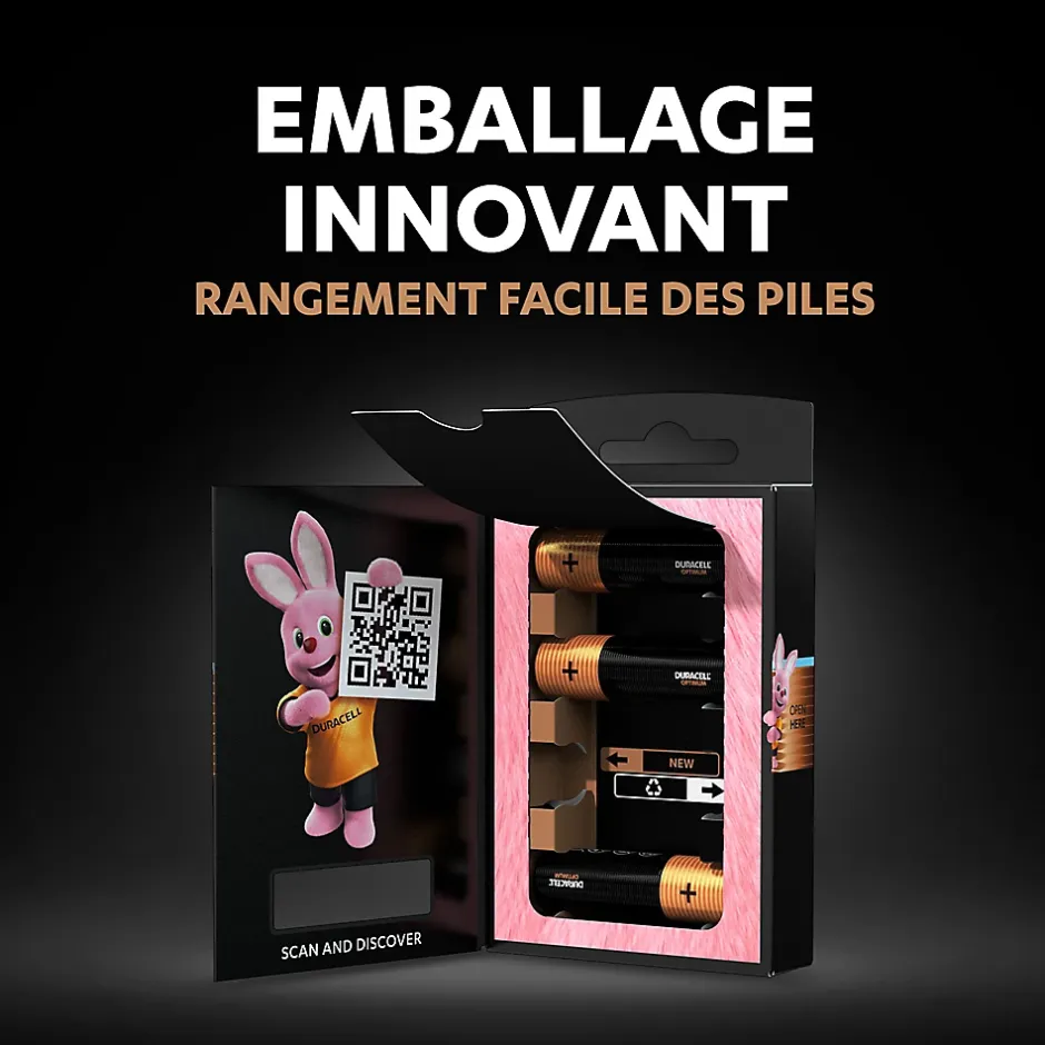 - EMBALLAGE INTELLIGENT : L’emballage Duracell Optimum permet de stocker les piles neuves et usagées et de les ramener en sécurité jusqu’au bornes de recyclage.