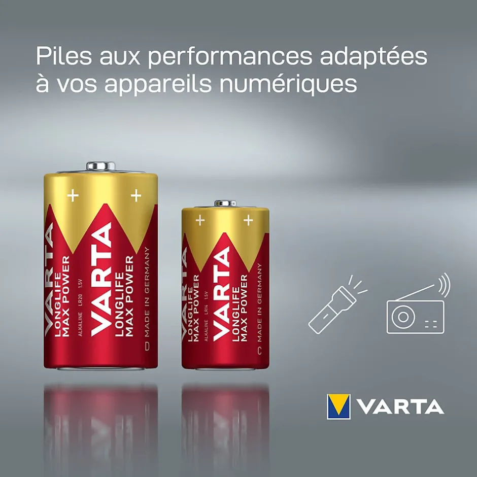 Les piles Varta Long-life Max Power fournissent une énergie parfaitement dosée. Idéales pour les appareils high-tech tels que les manettes de jeu, les appareils photo numériques et les tensiomètres