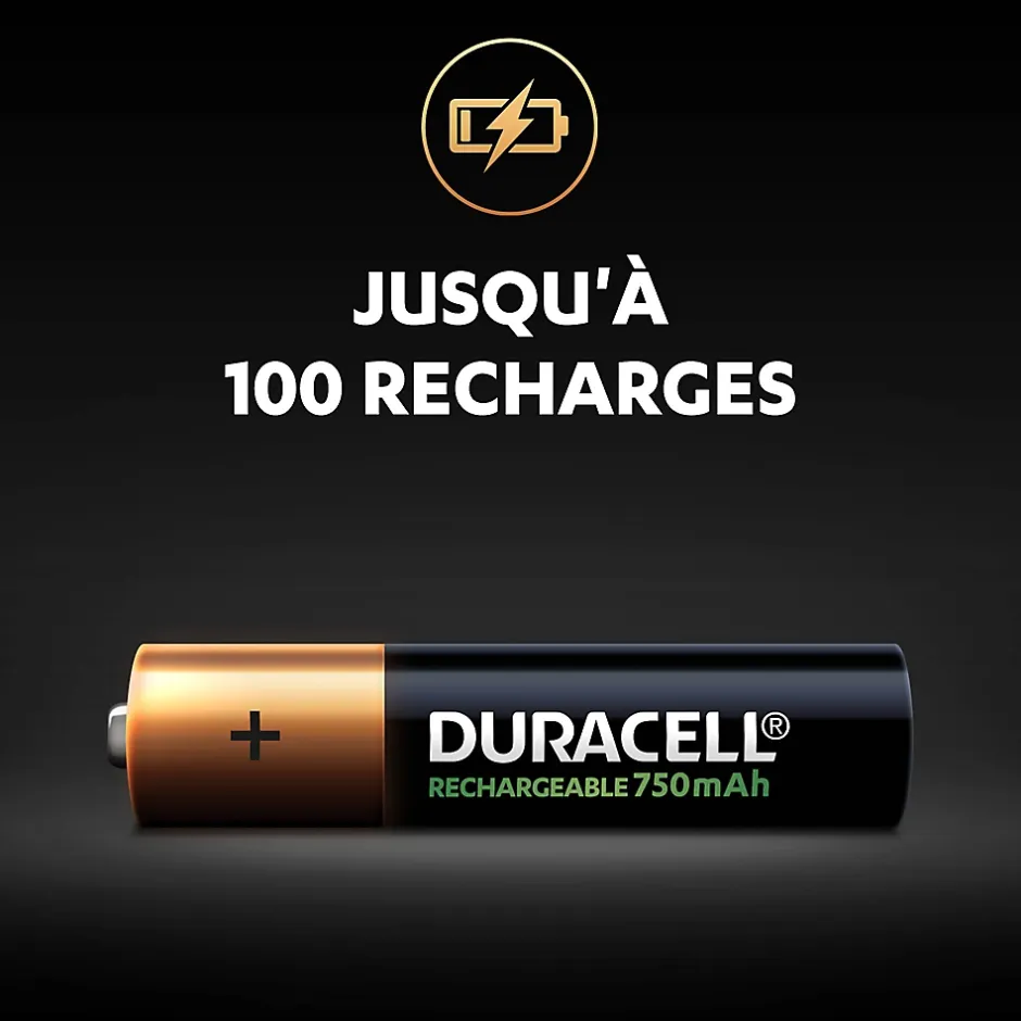 - Les piles rechargeables Duracell AAA 750mAh peuvent être rechargées jusqu’à 100 fois.