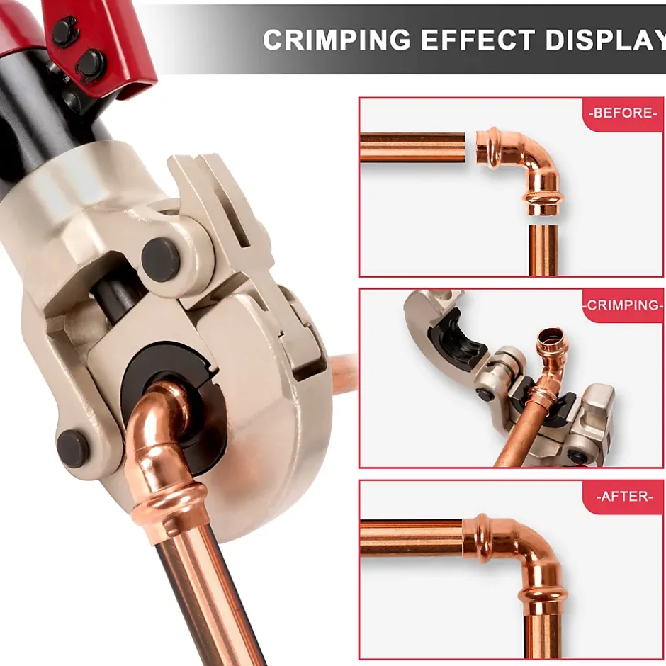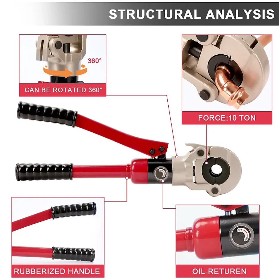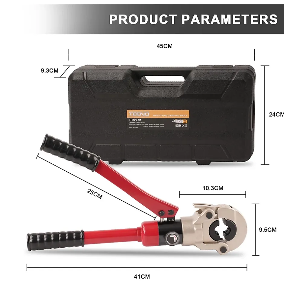 Description du produit:Système d’entraînement hydraulique: Contrairement aux outils manuels similaires qui reposent sur l’effet de levier et la force de la main, nos outils hydrauliques de sertissage de raccords de tubes en cuivre sont conçus avec des cylindres hydrauliques pour économiser la main d’œuvre. Une seule personne suffit pour réaliser des raccords sans fuite, ce qui élimine le besoin de brasage, de soudure ou d’évasementTête rotative à 360°:La tête de la pince est conçue à 360 degrés, elle peut être tournée et ajustée, vous pouvez la tourner de manière flexible en fonction des différents scénarios d’utilisation pour une utilisation plus confortableFonctionnement rapide: La tête est équipée de ressorts à roulement à billes à l’intérieur de la tête, ce qui vous permet de changer la matrice de sertissage pour différentes tailles en la faisant simplement glisser pour répondre à tous vos besoins, ce qui en fait la solution la plus rapide pour l’entretien et la réparation des tuyauxMatériaux de haute qualité: le corps de la pince à sertir les tuyaux est en 40Cr pour une plus grande résistance ; les poignées en caoutchouc épais et isolé sont antidérapantes et antiélectriques ; le verrouillage automatique de la tête de la pince assure des connexions rapides et précisesLarge gamme d’applications: 100 kN/environ 10 Ton pour votre application. Gamme de sertissage Ø15-32mm, y compris moule de type TH (16mm/20mm/26mm/32mm), moule de type V (15mm/18mm/22mm/28mm), moule de type U (16mm/20mm/25mm/32mm)<ul class= »a-unordered-list a-vertical