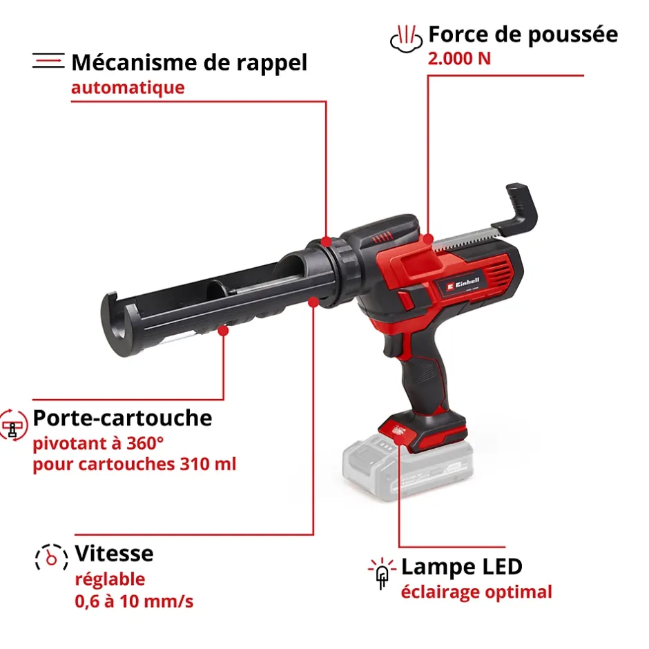 - Ce pistolet à cartouche exerce une force de poussée maximale de 2 000 N et sa vitesse de poussée se règle par l’intermédiaire de la molette et de la gâchette pour un filet régulier. La vitesse peut être réglée individuellement pour être adaptée aux différents matériaux utilisés et aux quantités requises.