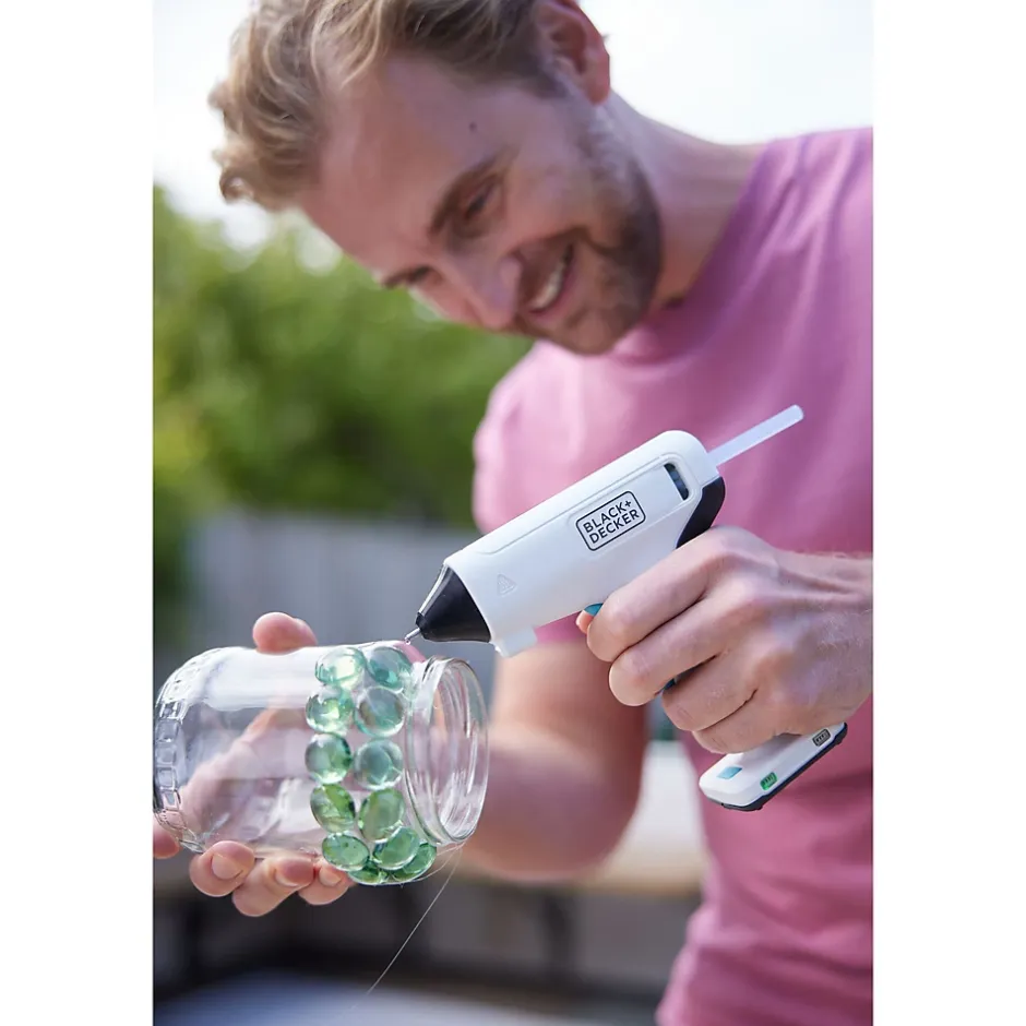 Pistolet à colle sans fil BLACK+DECKER BCGL115-XJ 3,6 V : chauffe en 30 s, batterie lithium 1,5 Ah (autonomie ~25 min), recharge USB‑C (~2,5 h), LED intégrée, arrêt de sécurité automatique et 20 sticks 7×100 mm inclus.
