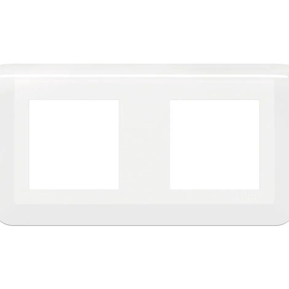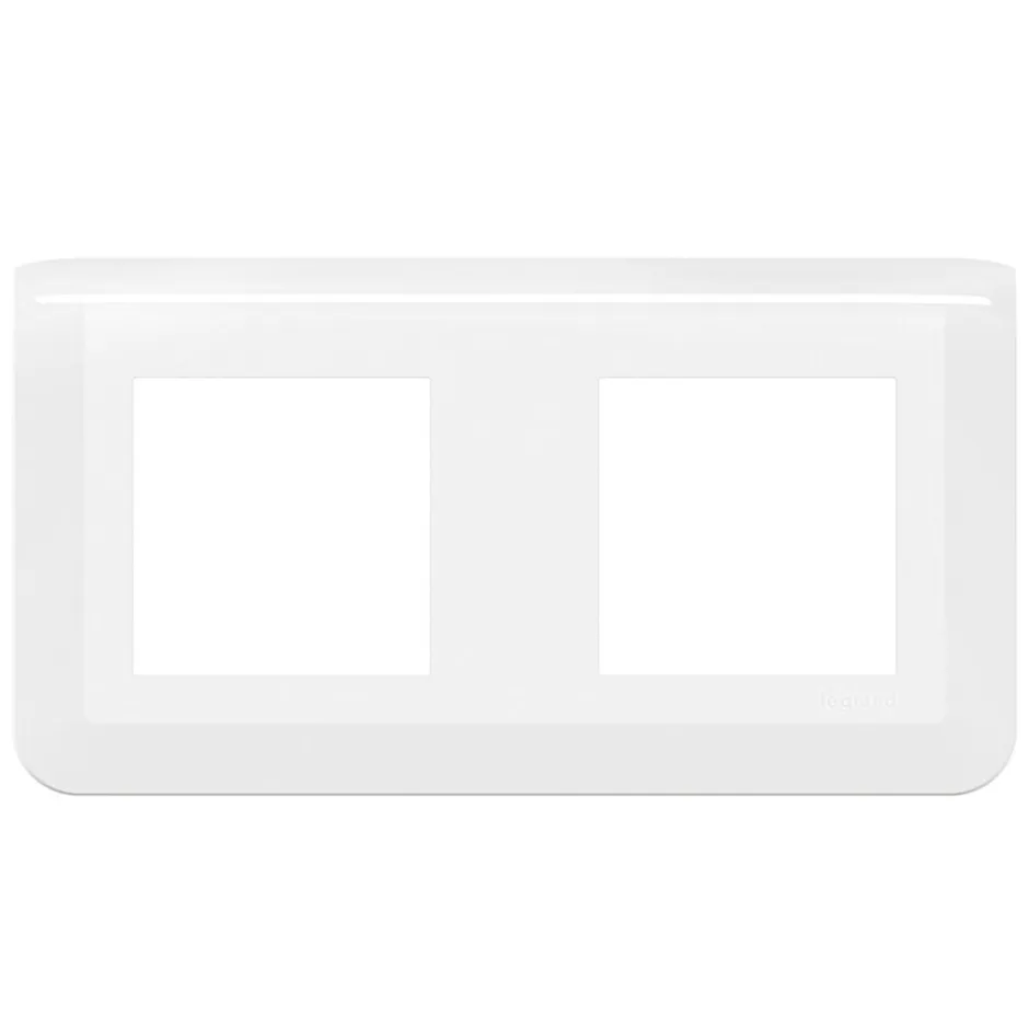 Plaque de finition Legrand Mosaic blanche brillante pour montage horizontal, compatible supports Batibox 4 modules (Réf. 080252). Thermoplastique halogène-free, IK04, usage intérieur.
