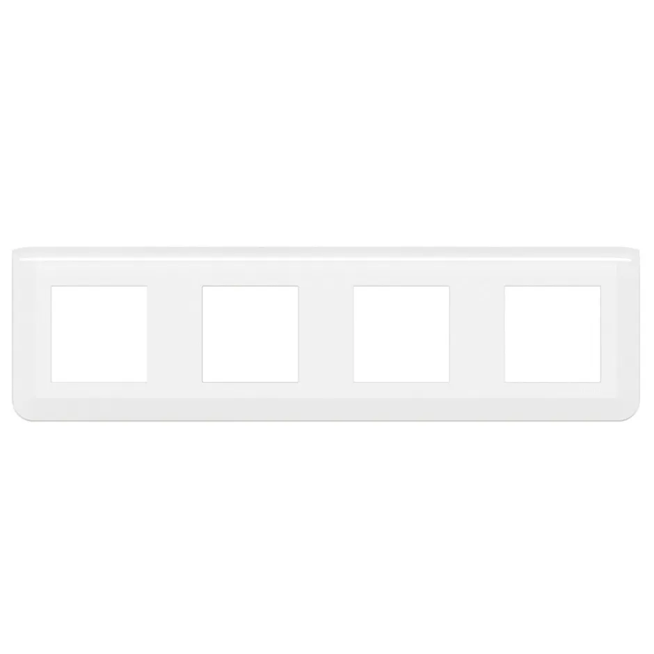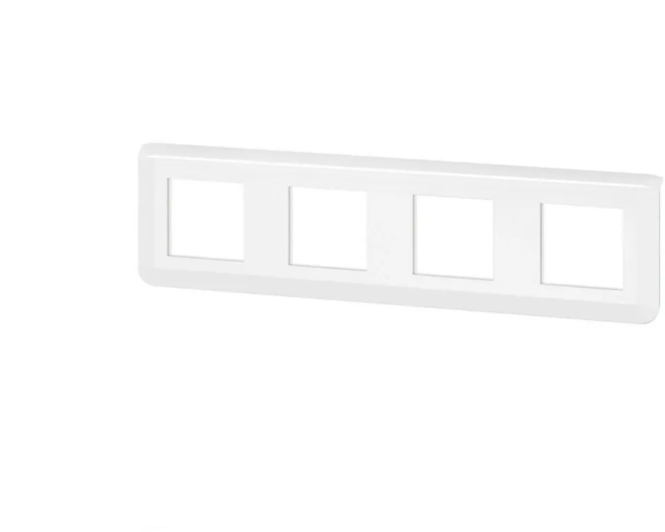 Plaque de finition horizontale Legrand Mosaic 4 postes (4×2) blanche, finition brillante, se clipse sur support Batibox réf. 080254, entraxe 71 mm, poids léger 70 g, destinée à un usage intérieur avec les modules Mosaic.