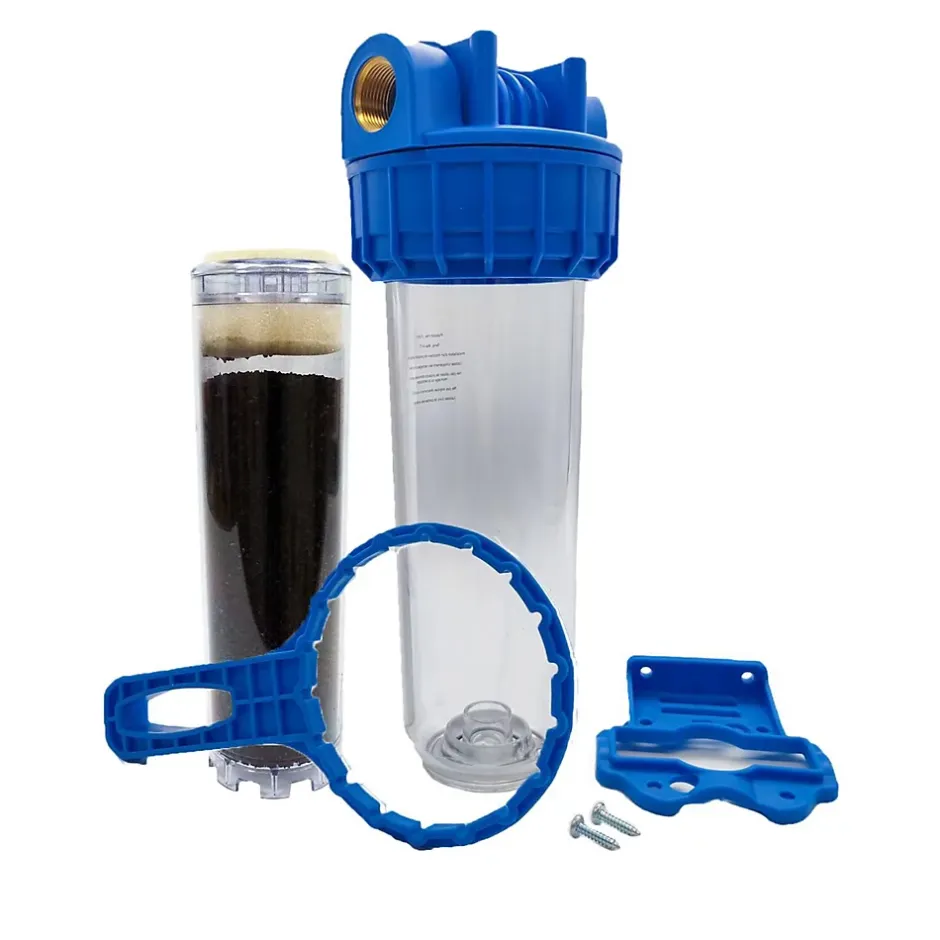 Porte-filtre taille standard pour cartouche de filtre au charbon actif 9″3/4.L’ensemble est composé de 3 pièces avec une bague de serrage tournante qui assure une étanchéité optimale entre le bol transparent et la tête.Ce kit de porte filtre 9″3/4 est idéal pour obtenir une qualité d’eau potable irréprochable et sans impuretés. L’eau conserve tous ses minéraux et oligo-éléments.Elle peut être combiné à d’autres porte-filtres en série afin de compléter l’action de filtration. (Toutes les cartouches compatibles sont disponibles sur notre boutique.)Ce filtre est particulièrement indispensable pour filtrer et assainir l’eau de ville ou une eau de forage.Compatible avec les cartouches de filtre à sédiment 9 pouces 3/4 allant de 1µm à 100µm.Contenu du kit de porte-filtre 9″3/4 insert laiton 20/27 avec cartouche charbon actifLe porte filtre complet (bol + tête)1 cartouche au charbon actif pour la purification de l’eau potable.1 Clé de montage / démontage.1 équerre de fixation.2 vis2 mamelons laiton Mâle – Mâle 20/27 (3/4″).