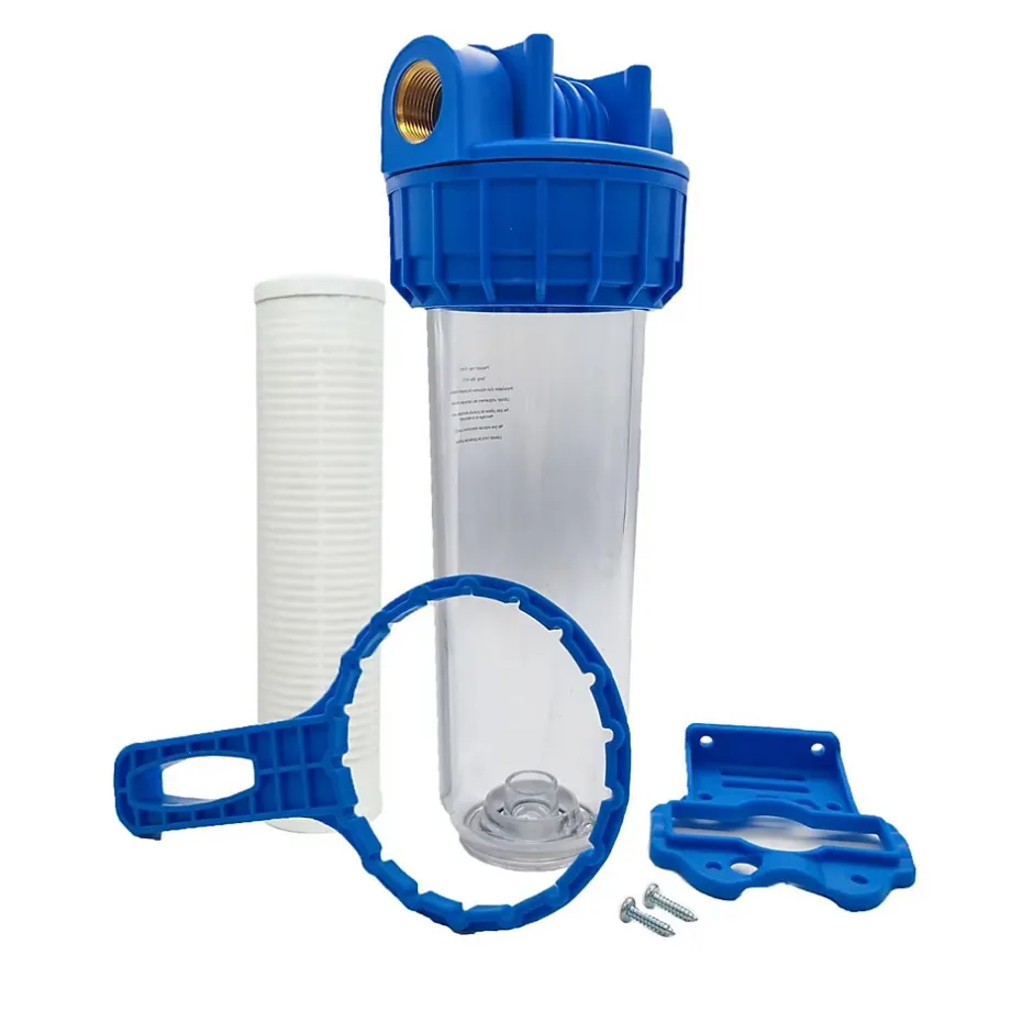 Porte-filtre pour cartouche lavable filtrante de sédiments 9″3/4 60µm.L’ensemble est composé de 3 pièces avec une bague de serrage tournante qui assure une étanchéité optimale entre le bol transparent et la tête.Ce kit de porte filtre 9″3/4 est idéal pour traiter les sédiments présents dans l’eau mais peut être combiné à d’autres porte-filtres en série afin de compléter l’action de filtration. (Toutes les cartouches compatibles sont disponibles sur notre boutique.)Il est particulièrement utile pour faire de la préfiltration, pour être installé sous votre évier, en amont de votre adoucisseur d’eau ou même en série grâce à un mamelon laiton mâle/mâle pour traiter l’eau potable.Compatible avec les cartouches de filtre à sédiment 9 pouces 3/4 allant de 1µm à 100µm.Contenu du kit de porte-filtre 9″3/4 insert laiton 26/34 avec cartouche anti sédiments lavable 60µmLe porte filtre complet (bol + tête)1 cartouche lavable pour la filtration des matières solides1 Clé de montage / démontage.1 équerre de fixation.2 vis2 mamelons laiton Mâle – Mâle 26/34 (1″).