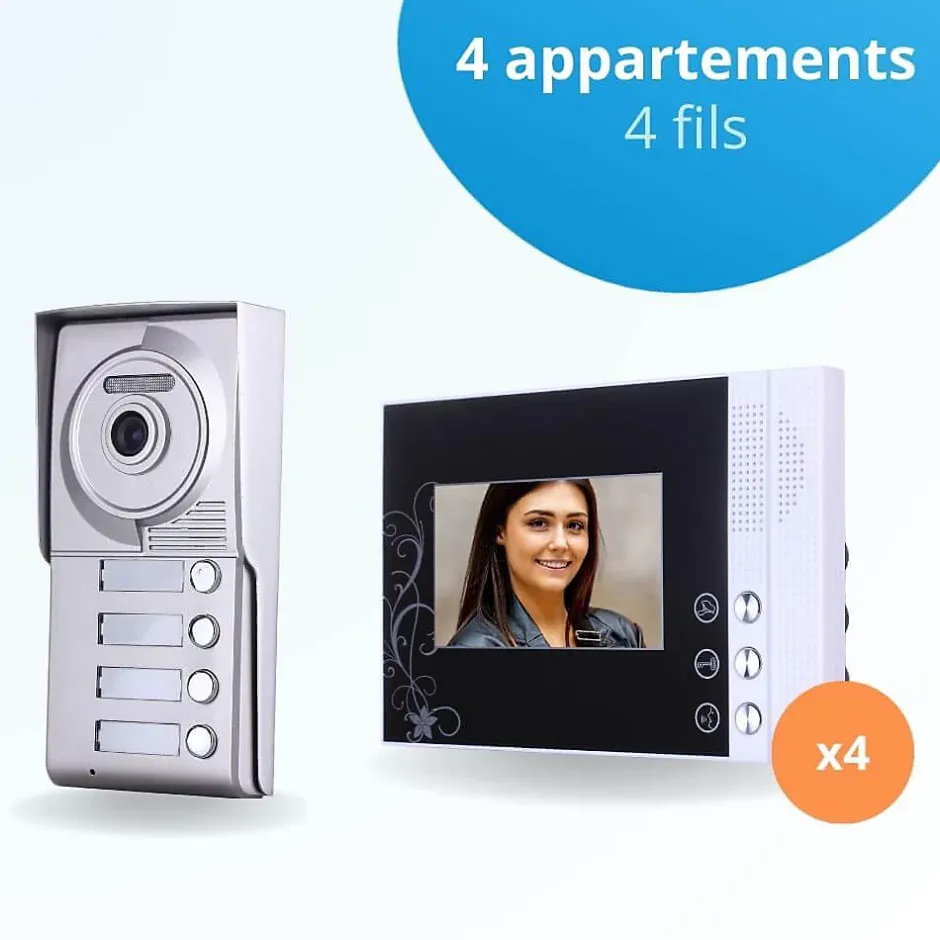 - Kit visiophone 4 fils permettant de contrôler l’accès de 4 appartements grâce au portier 4 boutons et aux 4 stations intérieures couleurs.