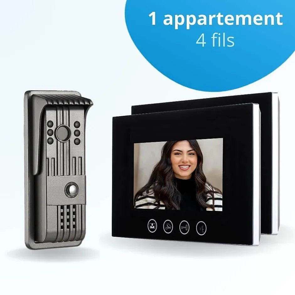 Vous avez besoin de sécuriser simplement l’accès à votre maison ?Cet ensemble visiophone répond à votre besoin en vous permettant de voir qui est à l’entrée, de parler et d’ouvrir votre portillon sans avoir besoin de vous déplacer. Le tout à prix attractif ! Avec son portier vidéo capable de piloter une gâche électrique standard et ses écrans couleurs 7″, ce kit interphone vidéo est un choix simple et idéal pour une utilisation dans une grande maison ou un appartement.RAPIDE et facile à installerGrâce à son cablâge 4 fils entre la platine de rue et les écrans, le kit portier interphone PILI est facile et rapide à installer : 2 fils pour l’alimentation, 1 fil pour l’audio et 1 fil pour la vidéo.L’alimentation s’effectue à l’aide d’une alimentation modulaire (fournie) branchée à chaque écran. Le câblage entre la platine de rue et les écrans est à prévoir (non fourni) en fonction de la distance nécessaire.La platine de rue peut piloter directement une gâche électrique standard (à émission NO) en utilisant 2 fils supplémentaires allant de la platine directement à votre système d’ouverture.En option, il est possible de piloter une ventouse électromagnétique à l’aide d’un relais temporisé et même une motorisation de portail avec un relais classique.Fonctionnalités• Caméra infrarouge : à vision nocture procurant une v…