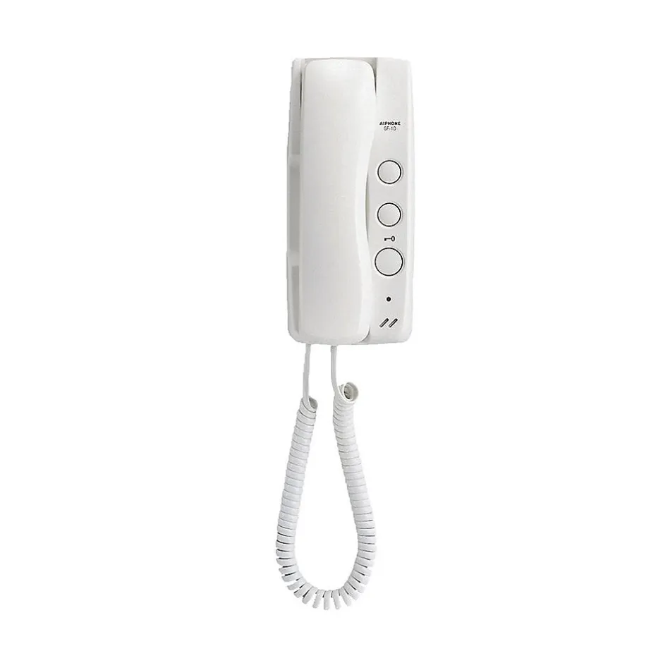 Poste audio avec combiné et boucle magnétique GT – AIP/GT1D – AIPHONELe poste audio avec combiné et boucle magnétique GT – AIP/GT1D de AIPHONE permet de piloter l’accès à distance à un appartement ou une résidence. Il est équipé d’un bouton d’accès, d’une touche de commande d’éclairage, et peut être désactivé en cas de besoin. Il est conforme à la loi sur l’accessibilité avec une boucle magnétique pour les personnes ayant des difficultés auditives. Il est possible de raccorder jusqu’à deux postes audio intérieurs pour répondre aux visiteurs et un poste décroché peut être appelé. Le boîtier en ABS blanc est facile à installer.Caractéristiques principales :Boîtier en ABS blancConnexion du combiné à la base type RJ11Fixation murale (vis non fournies)Touche d’ouverture de porteTouche de commande d’éclairageTouche de commande auxiliaireRéglage de la sonnerie et coupureVoyant de coupure sonnerieConnexion automatique des câbles (bornier intérieur sans vis)Possibilité d’installer 2 postes audio par appartementContact sonnerie porte palière, sonnerie différente de l’appel portierGestion des professions libéralesSecret de conversation inclusUn poste décroché ne bloque pas l’installation, même décroché : il peut être appelé, en aucun cas, un poste peut libérer la porte sans appelLargeur : 89 mmHauteur : 200 mmProfondeur : 63 mm