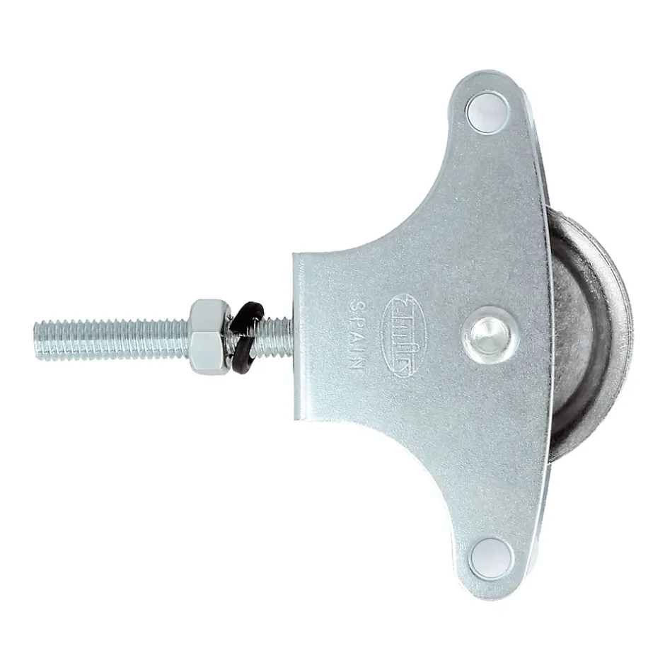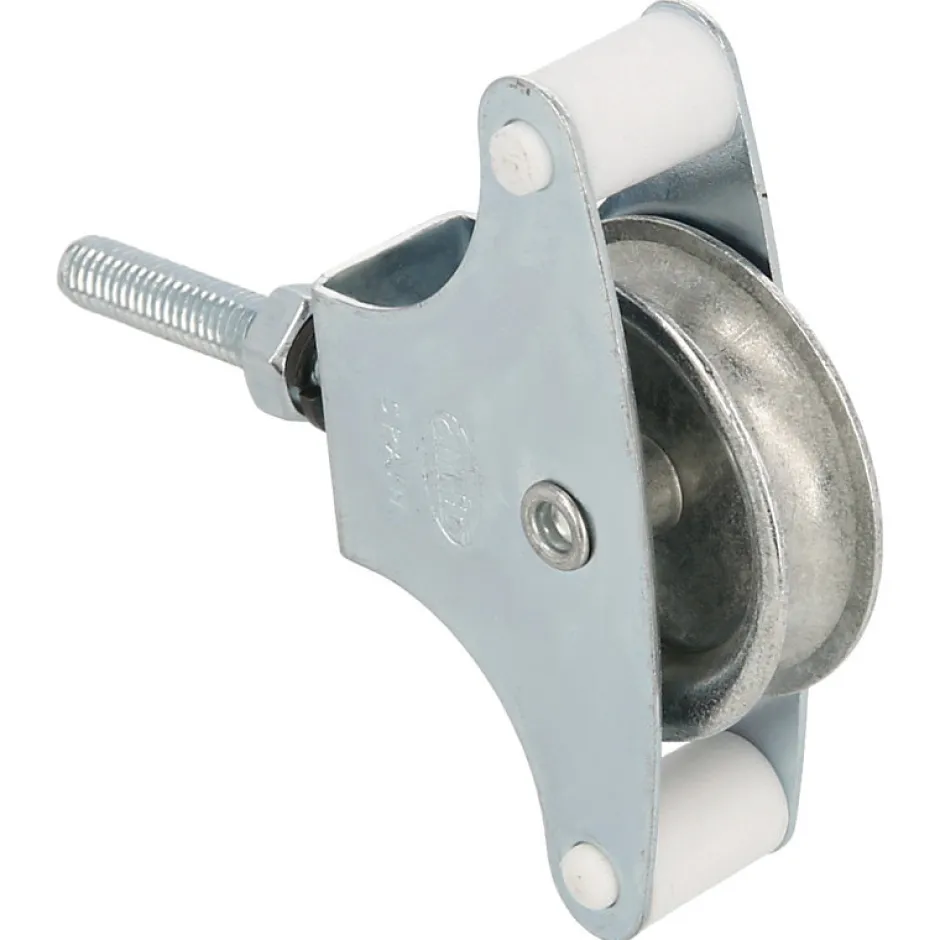 Poulie en acier avec roulette métallique de Ø 39 mm. Avec boulon de fixation et avec guides. Pour étendoirs. Poulie pour corde à linge avec corps en acier zingué. Poulie métallique Ø 39 mm avec canal de 8 mm. Guides de sécurité en plastique inclus. Fixation par vis M6 avec rondelle et écrou inclus.