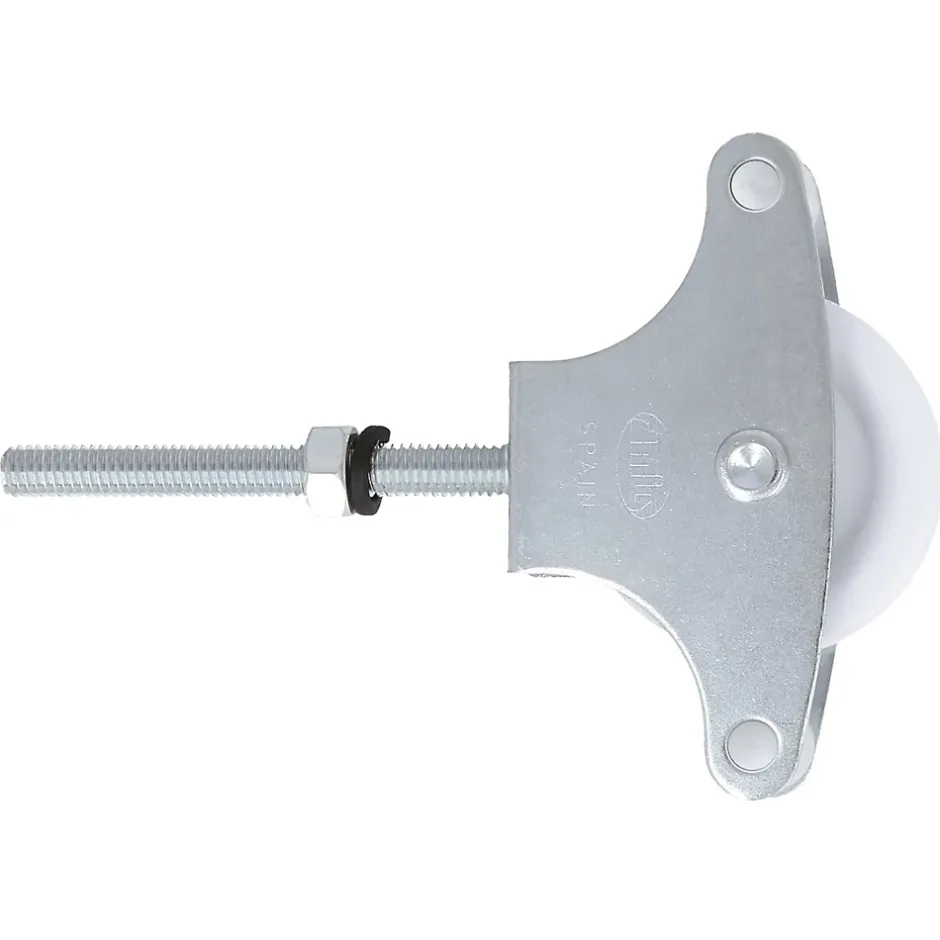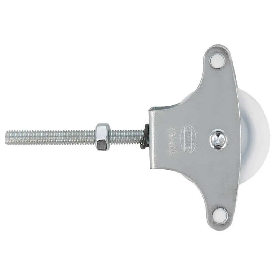 Poulie en acier avec roulette en plastique de Ø 39 mm. Avec boulon de fixation et avec guides. Pour étendoirs. Poulie pour corde à linge avec corps en acier zingué. Poulie en plastique Ø 39 mm avec canal de 8 mm. Guides de sécurité en plastique inclus. Fixation par vis M6 avec rondelle et écrou inclus.