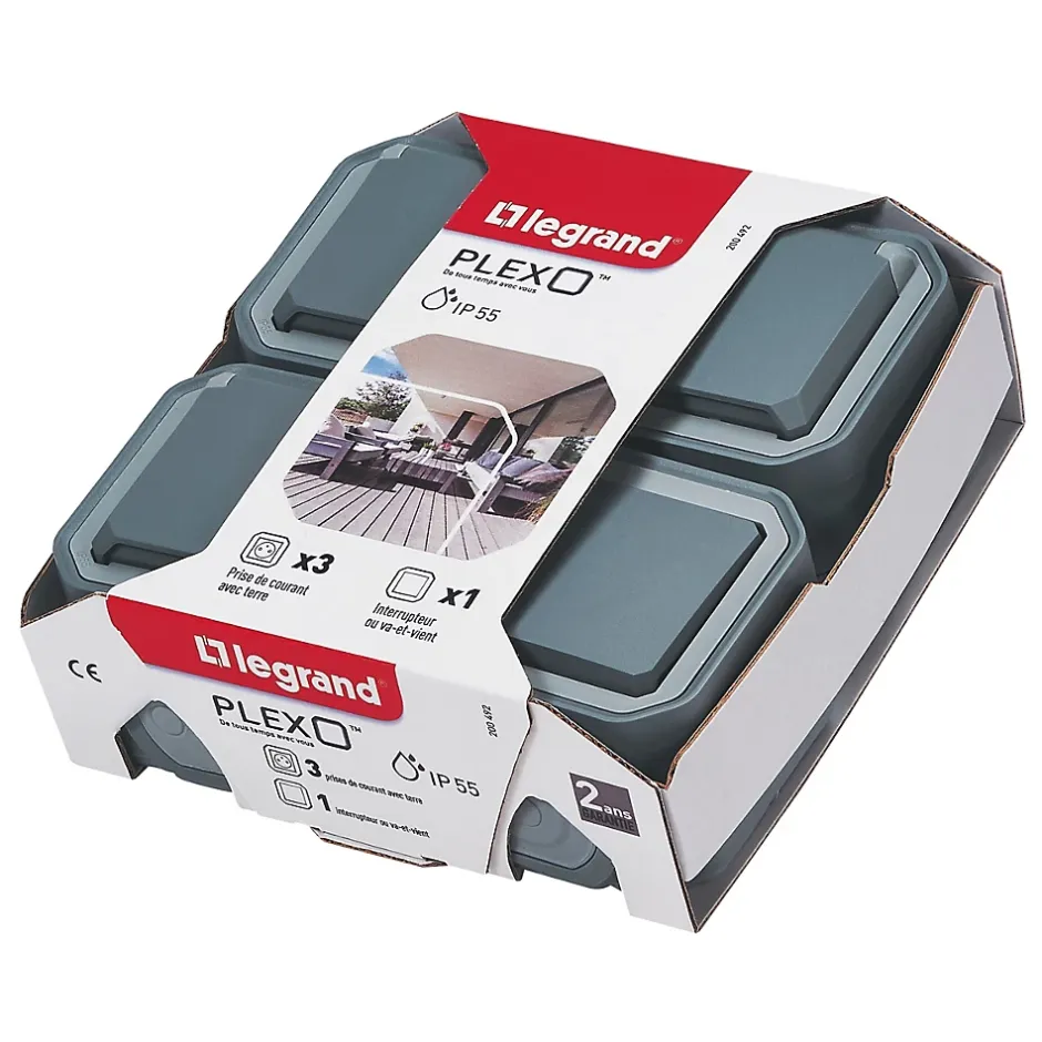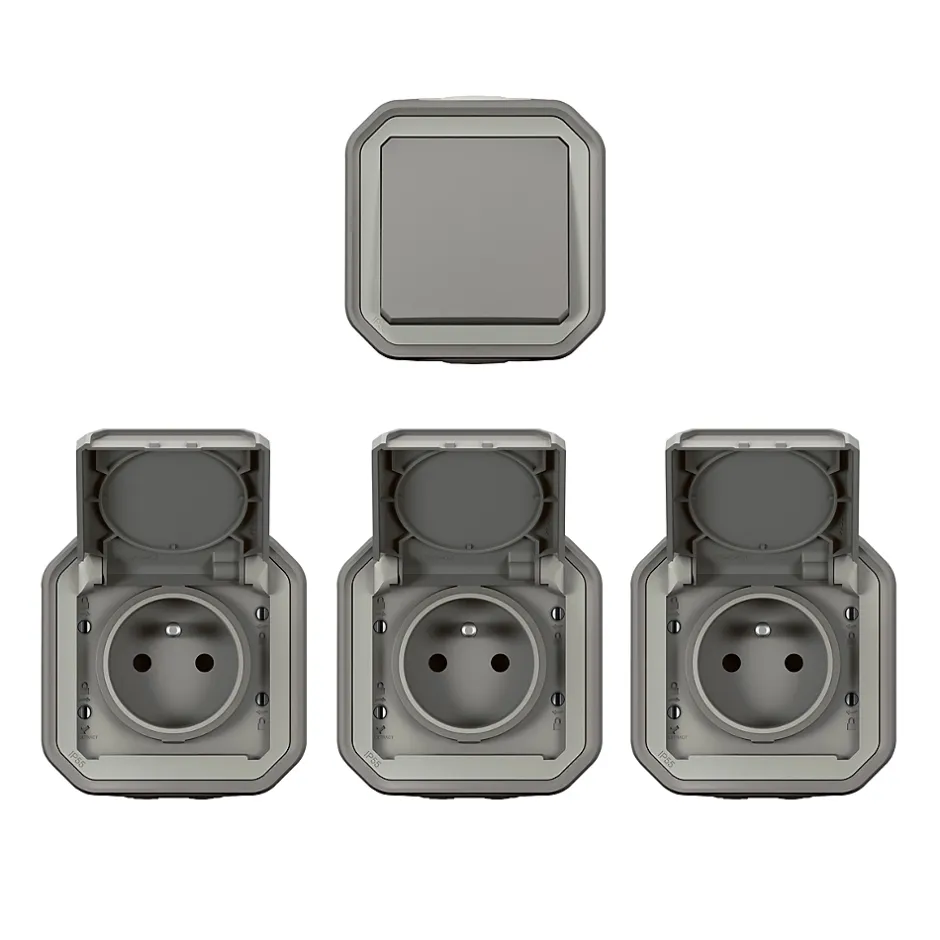 Lot de 3 prises 2 pôles+terre et 1 interrupteur Legrand Plexo gris