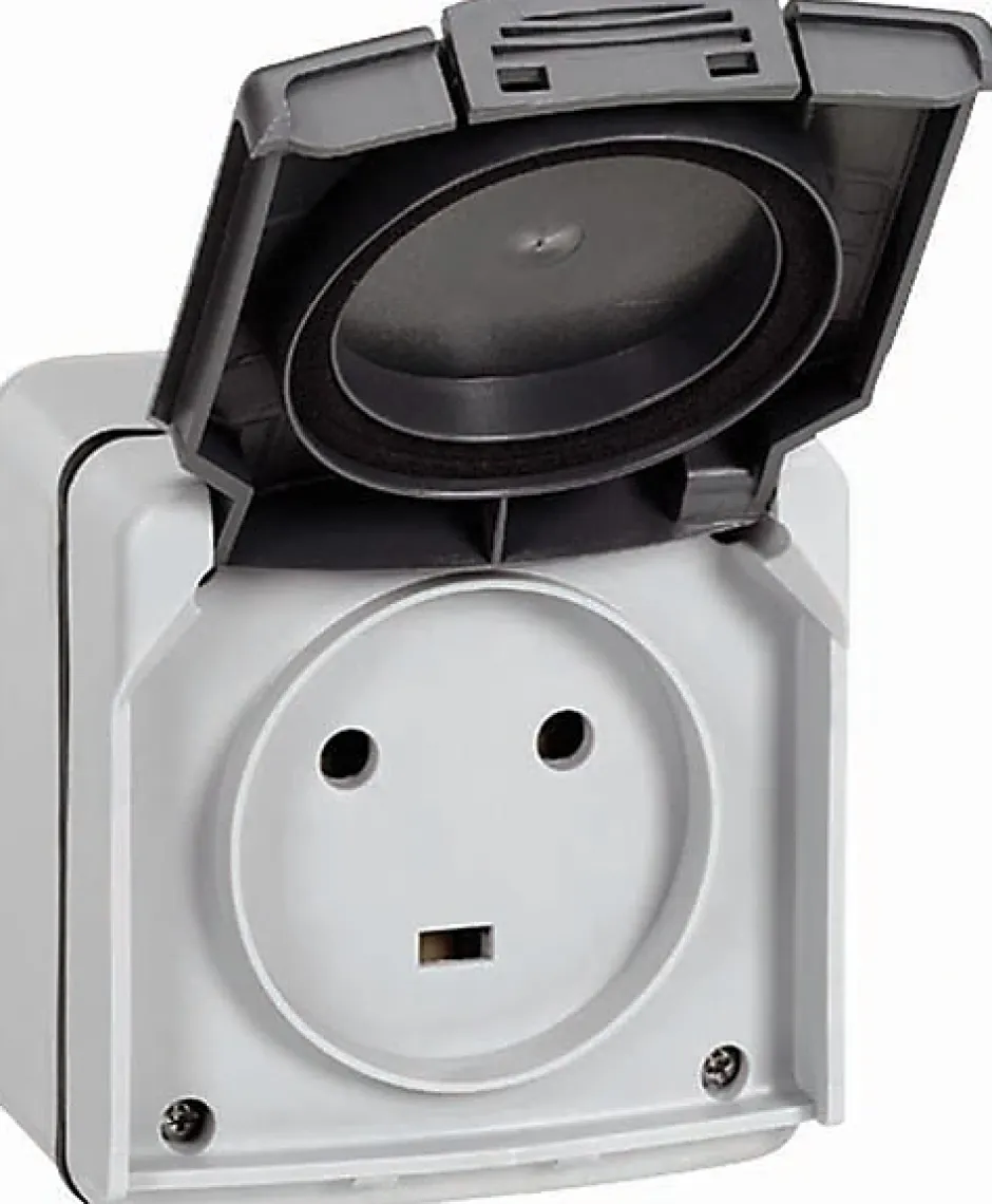 Prise de courant de puissance 2P+T. Gamme : Plexo. Type de pose : en saillie. Intensité : 20A. Indice de protection : IP55. Matériau : plastique thermoplastique robuste. Résistance aux chocs : IK08. Applications : intérieur et extérieur, environnements humides ou poussiéreux Installation rapide et compatible avec mécanismes Plexo. Convient aux appareils haute puissance et installations exigeantes