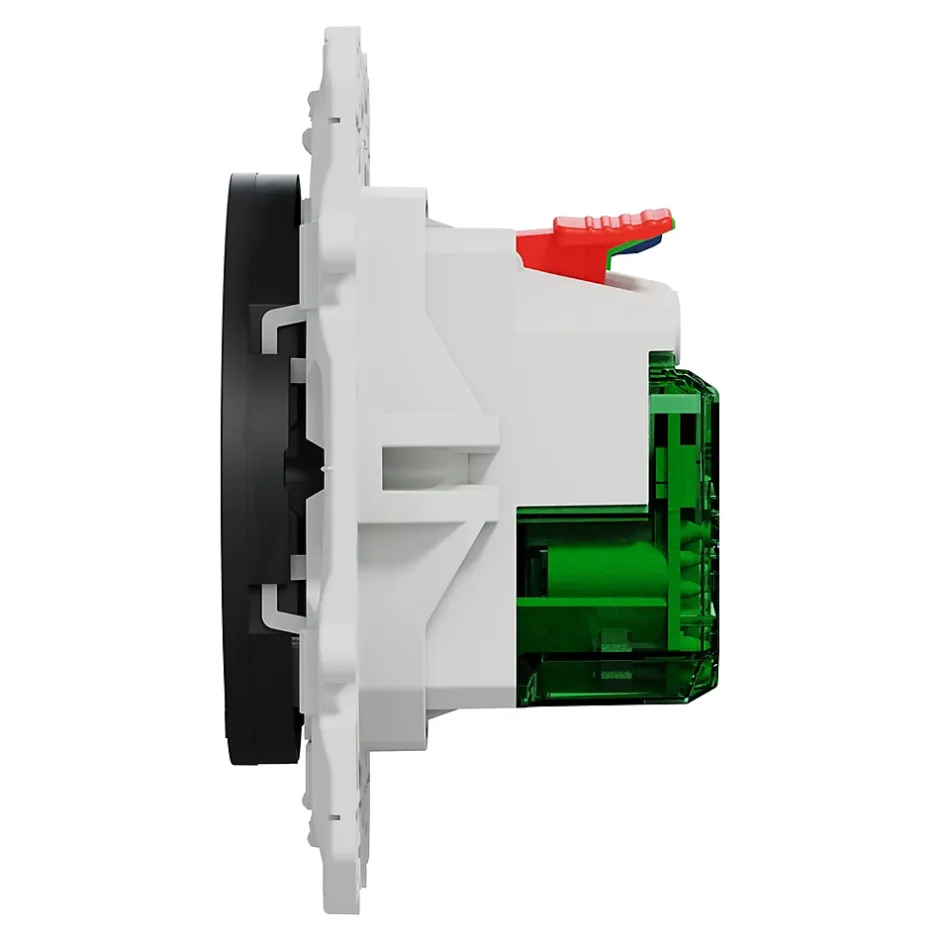 Odace – prise de courant affleurante – 2P+T – avec USB C puissance 10.5W en 1 poste – Anthracite – fixation par vis – Raccordement : 1 x 1,5 .. 2 x 4 mm = souple / rigide / multibrin – bornes vis – 16 A – 250 VCA 50 Hz – NF – IK04 IP21D Prise S54B089 Schneider Electric de la gamme Odace combinant une prise d’alimentation double associée à un port USB. Cette prise affleurante double avec terre 250VCA 16A munie d’un port USB de type C 2,4A est de couleur anthracite. Avec son port USB de type C délivrant 10,5 W, vous pourrez charger tous vos appareils connectés (smartphone, tablette, montre…). Composé de son mécanisme et cadre de fixation, cette prise affleurante s’encastre dans la surface du mur. Mode de fixation par vis, se fixe très rapidement et facilement. En matière de sécurité, la prise USB double S54B089 a un indice de protection eau et poussières IP20. Elle est à associer avec une plaque de finition de la gamme Odace pour s’intégrer avec discrétion et élégance dans votre décoration. Large choix de designs et d’accessoires pratiques, la gamme Odace vous permet de composer et d’assortir les couleurs et les combinaisons, pour que votre intérieur vous ressemble.