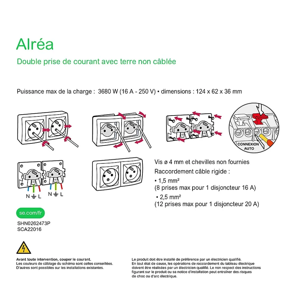 Prise de courant double avec 2 pôles + terre complète saillie Schneider Electric Alréa blanc