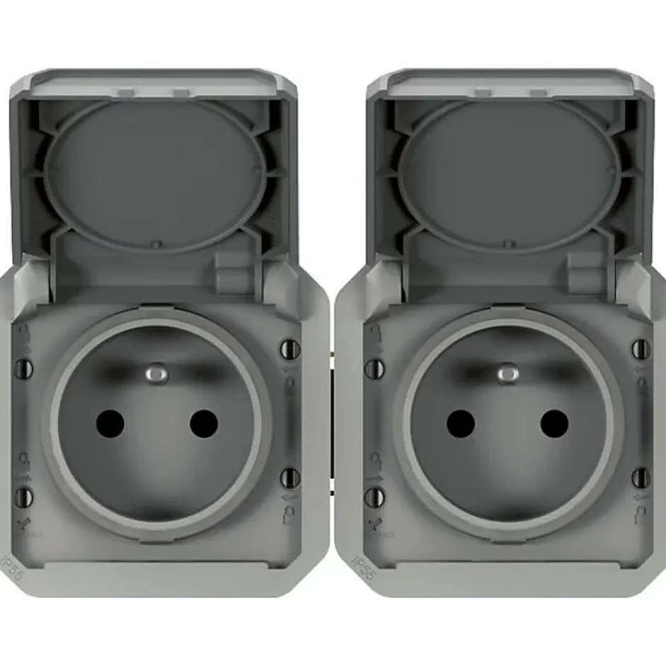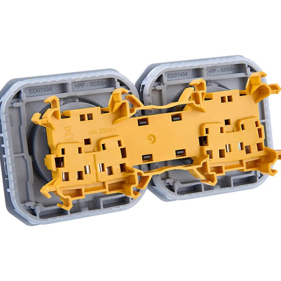 Legrand Plexo prise double précâblée 2x2P+T horizontale IP55, 16 A 250 V, volets de protection, protection enfant intégrée, connexions rapides sans outil et bornes repérées, montage en surface ou encastré avec support compatible, thermoplastique sans halogène gris mat RAL 7046, étanchéité assurée par fermeture frontale 4 points, IK07.