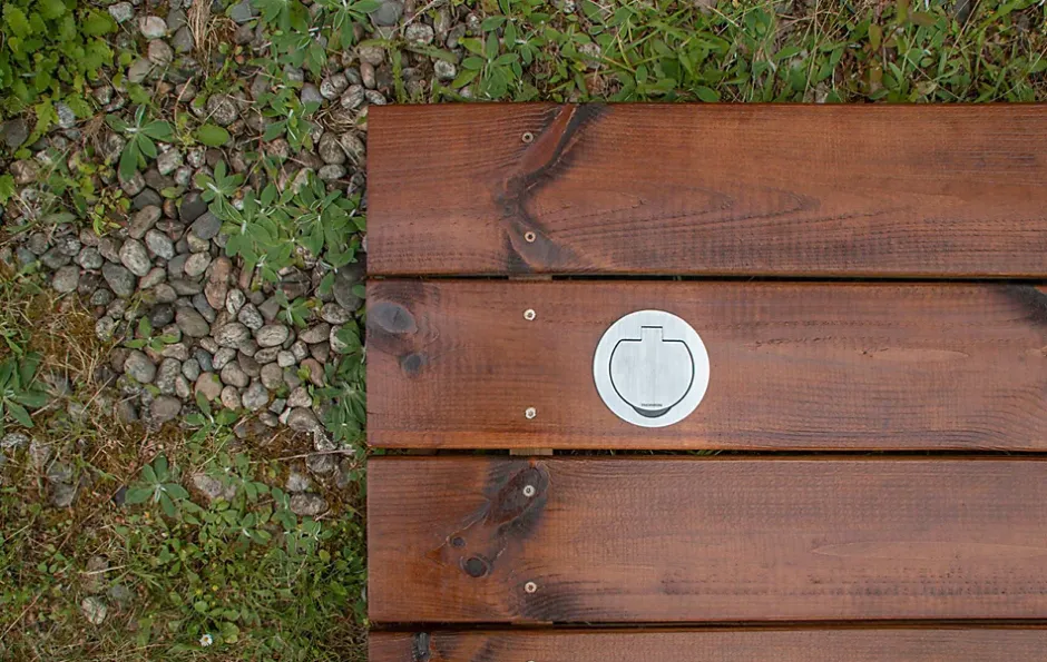 Prise étanche IP55 avec finition en métal brossé pour une installation en intérieur comme en extérieur, au sol ou au mur