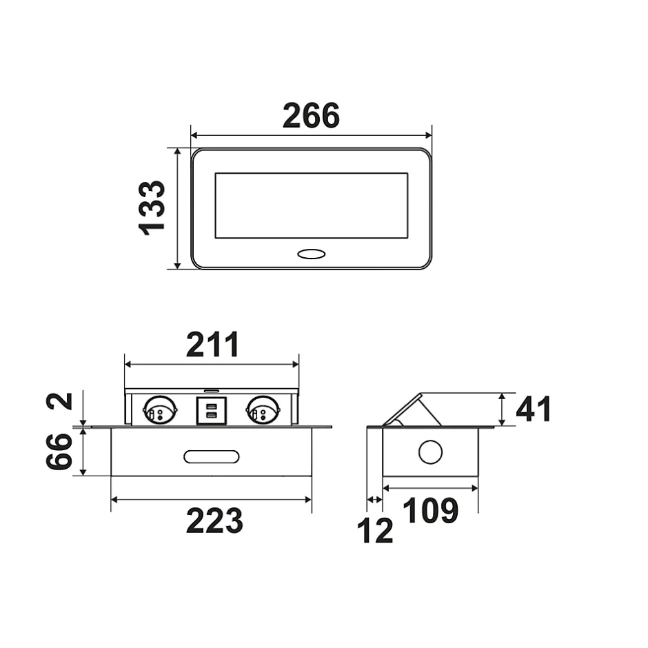 <p•• Multiprise encastrable •• 2 prises 230V •• 1 USB-A et 1 USB-C•• Prise noire