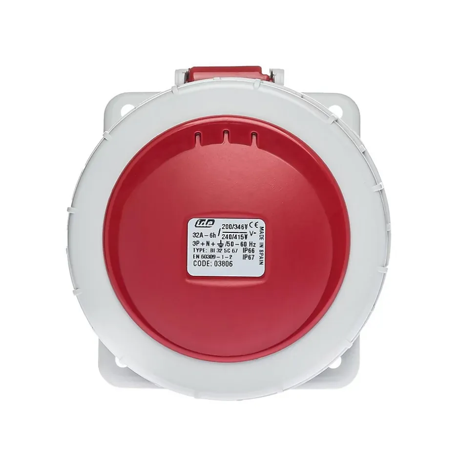 Prise femelle à encastrer tétrapolaire 5x32AConçue pour les installations industrielles exigeantes, cette prise femelle possède un certificat d’étanchéité renforcée IP67. Cette prise femelle encastrable 32A fonctionne en tripolaire (3P+N+T) sur une tension de 380V.Le raccordement de cette prise se fait par borne à vis avec une section de câble maximum de 10mm² en câble rigide et 6mm² en câble souple.Pour le câblage d’un coffret de prise, en 32A on utilise généralement du câble souple 6mm² avec embouts de câblage.Cette prise encastrable peut être montée sur un coffret de prise à personnaliser, elle est compatible avec les coffrets IDE Star.Sur devis nous pouvons vous câbler un coffret de prise monophasé/triphasé sur mesureL’essentiel sur la Prise femelle à encastrer 380VFabriqué en EspagneQualité professionnellePrise européenne compatible toute marque (Legrand; Schneider…)Vis de fixation en inox à commander séparémentÉtanchéité renforcée IP67