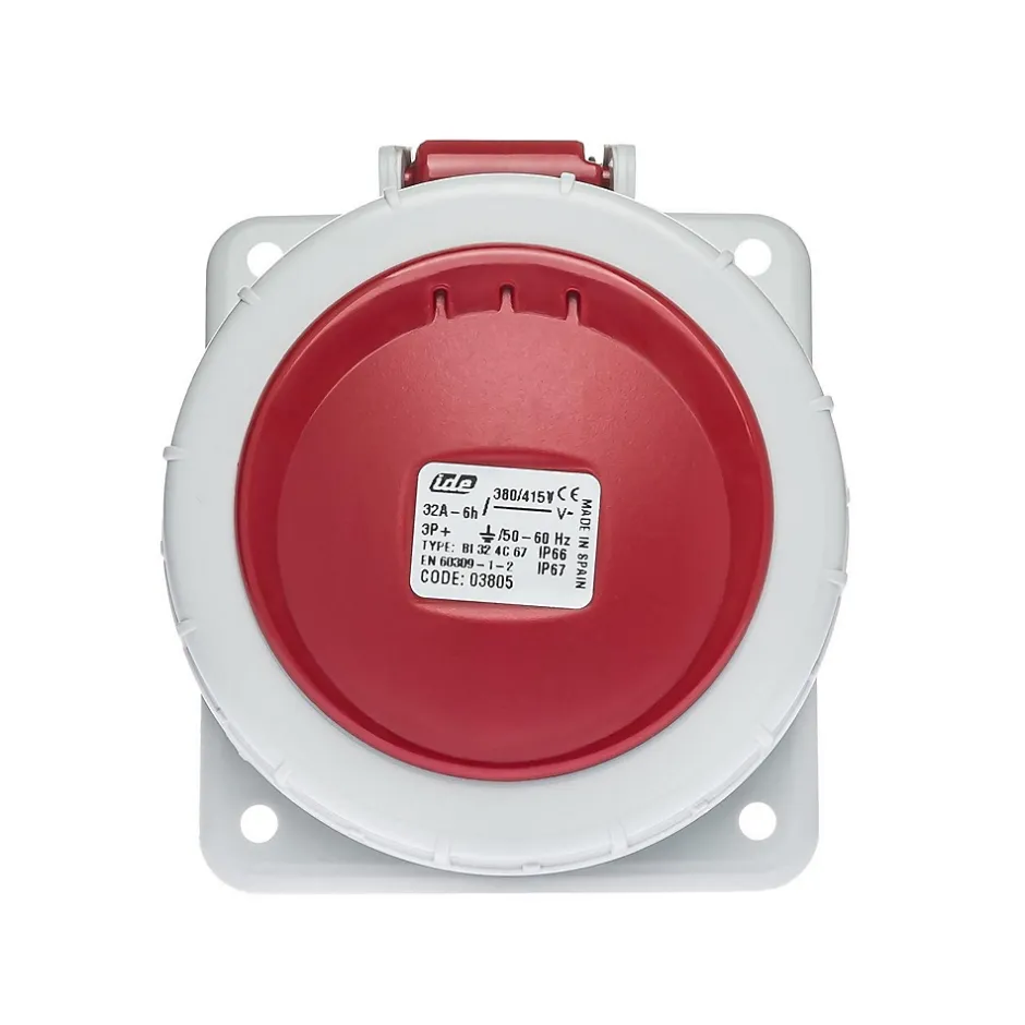 Prise femelle à encastrer tripolaire 4x32AConçue pour les installations industrielles exigeantes, cette prise femelle possède un certificat d’étanchéité renforcée IP67. Cette prise femelle encastrable 32A fonctionne en tripolaire (3P+T) sur une tension de 380V.Le raccordement de cette prise se fait par borne à vis avec une section de câble maximum de 10mm² en câble rigide et 6mm² en câble souple.Pour le câblage d’un coffret de prise, en 32A on utilise généralement du câble souple 6mm² avec embouts de câblage.Cette prise encastrable peut être montée sur un coffret de prise à personnaliser, elle est compatible avec les coffrets IDE Star.Sur devis nous pouvons vous câbler un coffret de prise monophasé/triphasé sur mesureL’essentiel sur la Prise femelle à encastrer 380VFabriqué en EspagneQualité professionnellePrise européenne compatible toute marque (Legrand; Schneider…)Vis de fixation en inox à commander séparémentÉtanchéité renforcée IP67