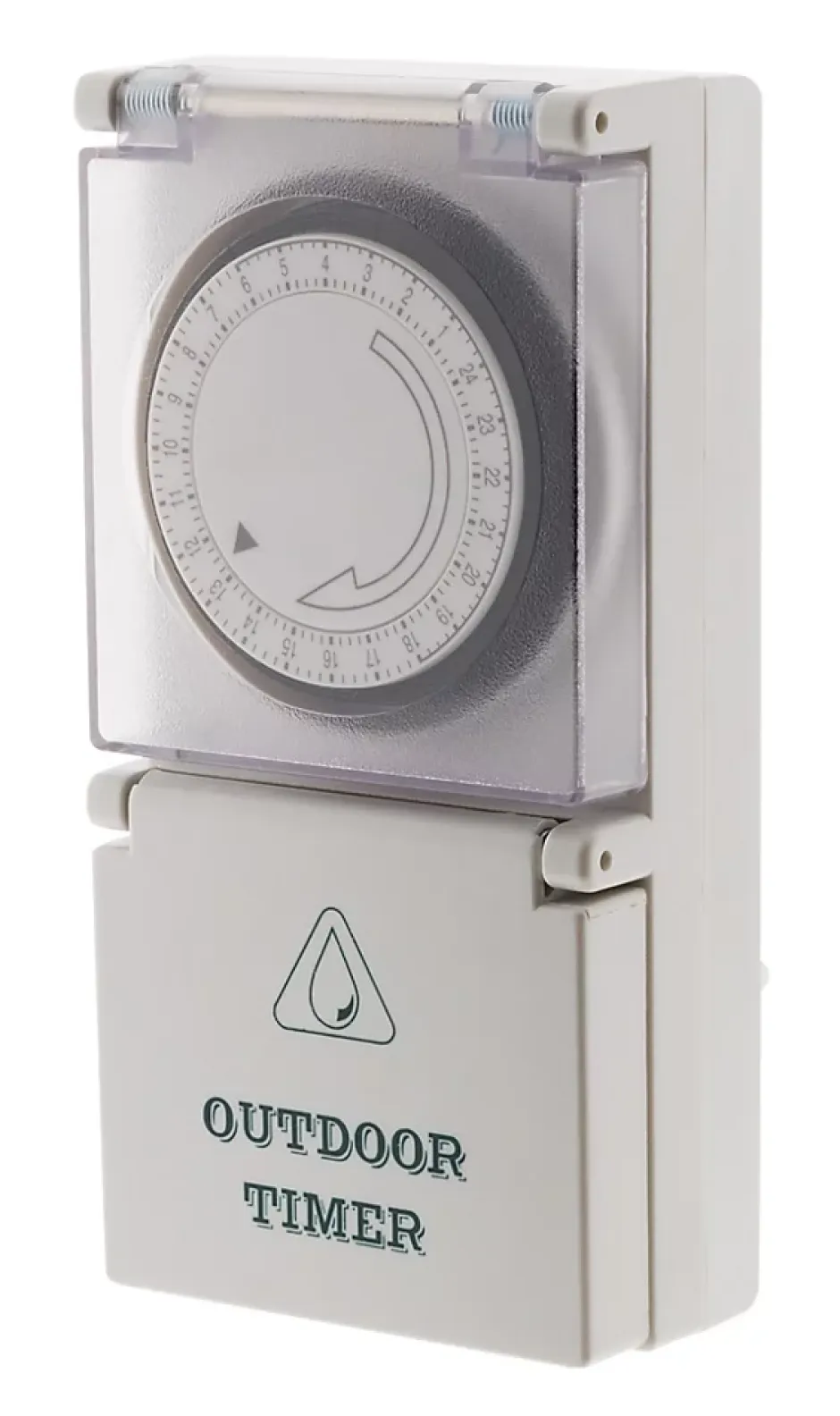 Programmateur mécanique de jardin. Couleur(s) : blanc. Utilisation : extérieure (étanche IP44). Programmation par tranches de 15 minutes. Tension : 220 – 240V, 50 Hz. Puissance maximale : 3680 W. Fréquence : 50 Hz. Installation : simple, à brancher directement sur une prise extérieure