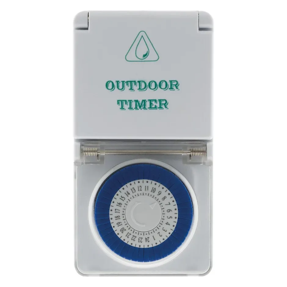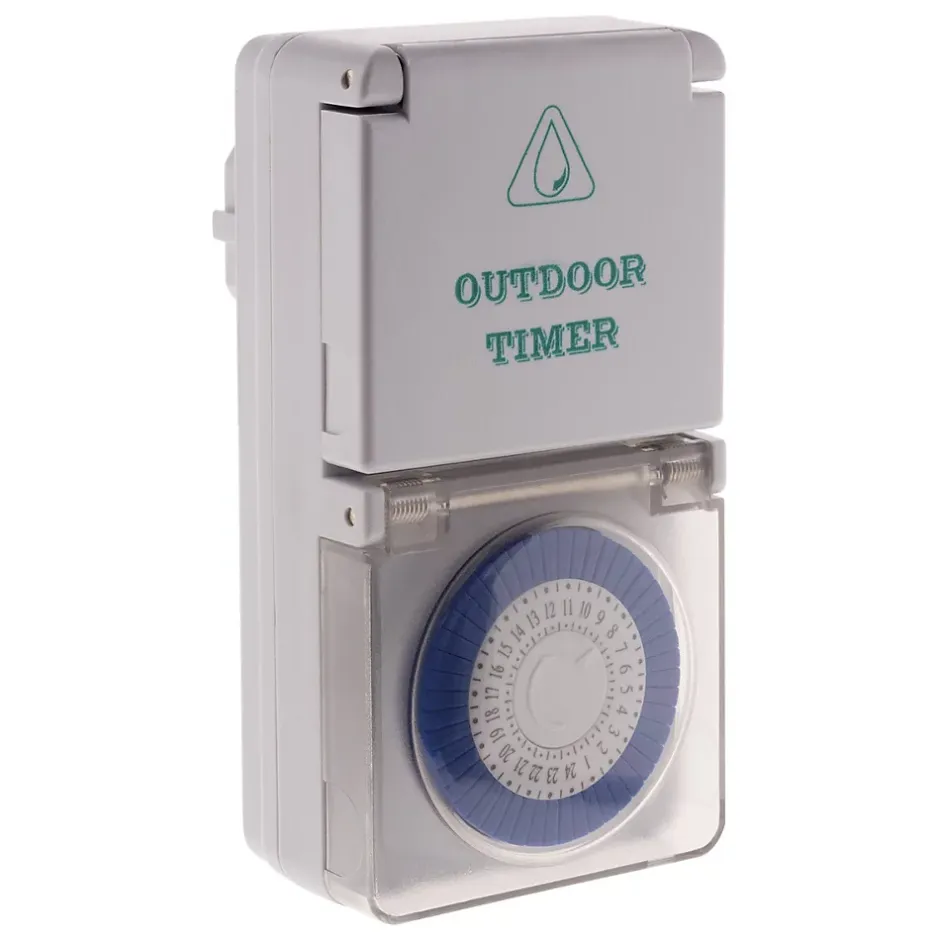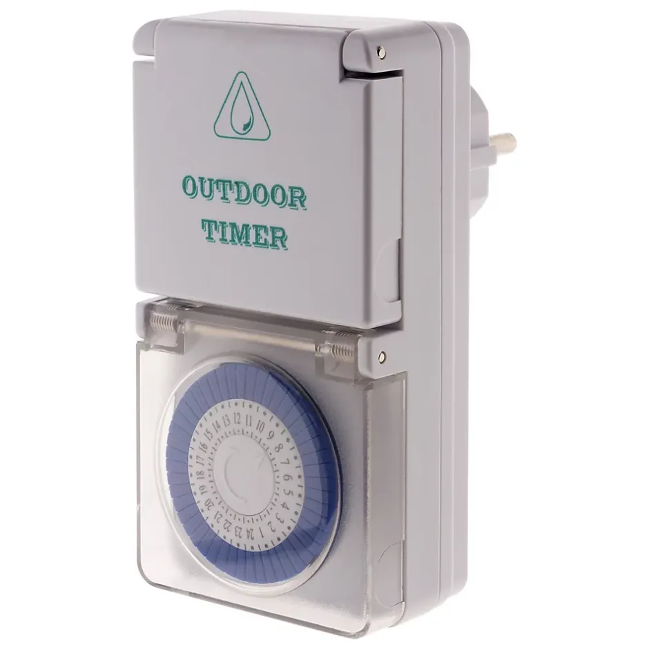 Programmateur mécanique étanche Schuko. Couleur(s) : blanc ou vert. Programmateur étanche. Indice de protection : IP44. Commutation toutes les 15 minutes. Recommandé pour les environnements humides ou en extérieur. Minuterie quotidienne. Sécurité enfants. Avec interrupteur