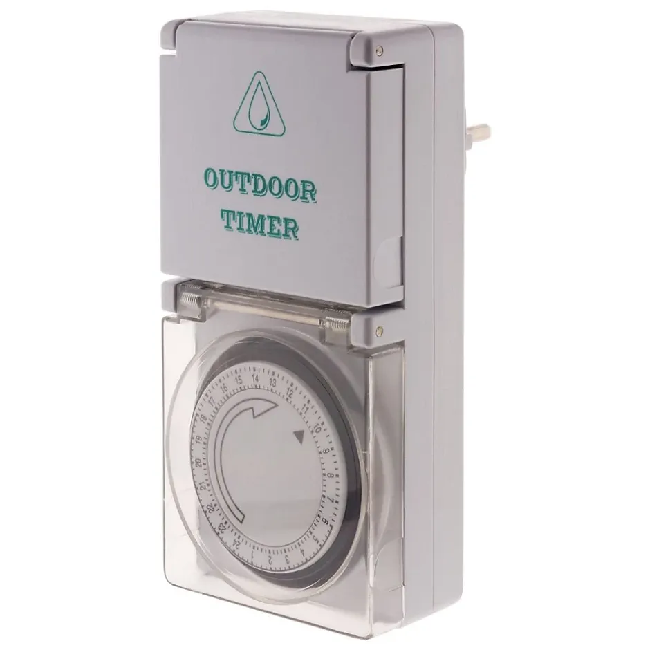 Programmateur mécanique étanche Schuko. Couleur(s) : blanc ou vert. Programmateur étanche. Indice de protection : IP44. Commutation toutes les 15 minutes. Recommandé pour les environnements humides ou en extérieur. Minuterie quotidienne. Sécurité enfants. Avec interrupteur