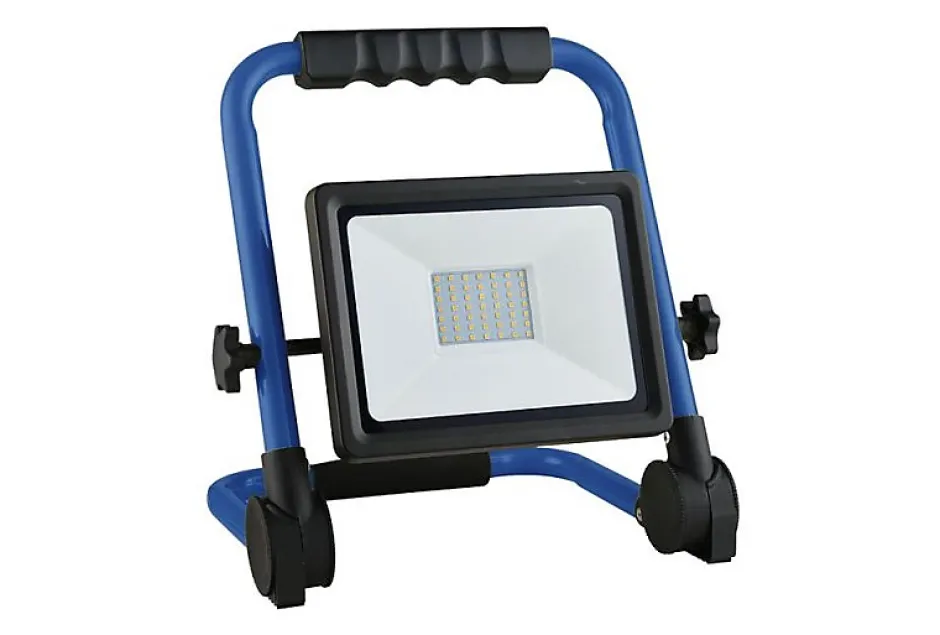 - Projecteur mobile LED 50 W Optiline en boîtier noir avec support pliable bleu.