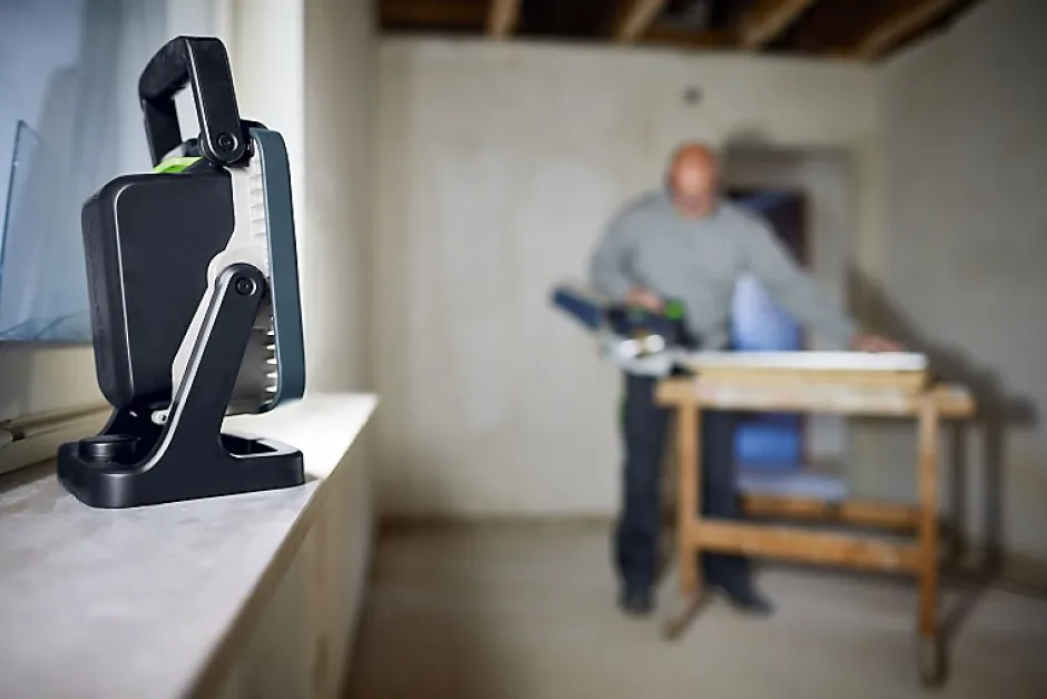 Le projecteur de chantier sans fil SYSLITE KBS C de Festool fournit un éclairage puissant et mobile pour travaux sur chantier. Équipé de 72 LED, il délivre jusqu’à 5000 lumens avec une température de couleur de 5000 K pour un rendu naturel. Le variateur permet d’ajuster la luminosité en continu selon vos besoins. Sa conception compacte intègre une poignée, des aimants pour fixation sur surfaces métalliques, la possibilité de suspension murale et le montage sur trépied. Le corps pivotant autorise un éclairage du sol au plafond. Robuste et adapté aux conditions difficiles, le boîtier résiste aux chocs, aux rayures et offre une protection IP54 contre la poussière et les éclaboussures. Fonctionne en 18 V et est compatible avec toutes les batteries Festool (sauf modèles Ergo). Autonomie : 0,5 heure par Ah (par exemple ~2 heures avec une batterie 4,0 Ah). Livré sans batterie ni chargeur.
