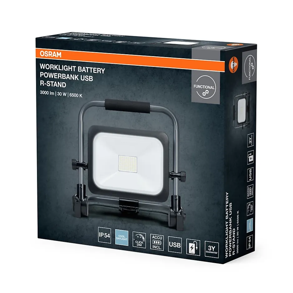 Lampe de travail mobile alimentée par batterie dans la classe économique. Caractéristiques du produit: Projecteur de chantier à tête pivotante. Lampe de travail portable alimentée par batterie. Batterie rechargeable via un câble USB. Avantages du produit: Fonction de charge USB à partir de la fonction de banque d’alimentation intégrée. Indépendant de l’alimentation sur secteur grâce à la batterie. Zones d’application: Rénovation. Garages. Ateliers. Sous-sol. Technique / Accessoires: Câble de chargement USB-C de 60 cm. Conseils de sécurité: Afin de réduire le risque d’étranglement, le câblage flexible connecté à ce luminaire doit être fixé efficacement au mur si le câblage est à portée de main.. Si le compartiment à piles (le cas échéant) ne se ferme pas correctement, cessez d’utiliser le produit et tenez-le hors de portée des enfants. Si vous pensez que des piles ont pu être avalées ou placées à l’intérieur d’une partie du corps, consultez immédiatement un médecin.. A éviter : Température ambiante maximale : +35 °C. Remplacement d’une batterie par un type incorrect qui peut neutraliser la sécurité (par exemple, dans le cas de certains types de batteries au lithium). Altitude pendant le fonctionnement : 2000 m. Jeter une batterie au feu ou dans un four chaud, ou écraser ou couper mécaniquement une batterie, ce qui peut entraîner une explosion..