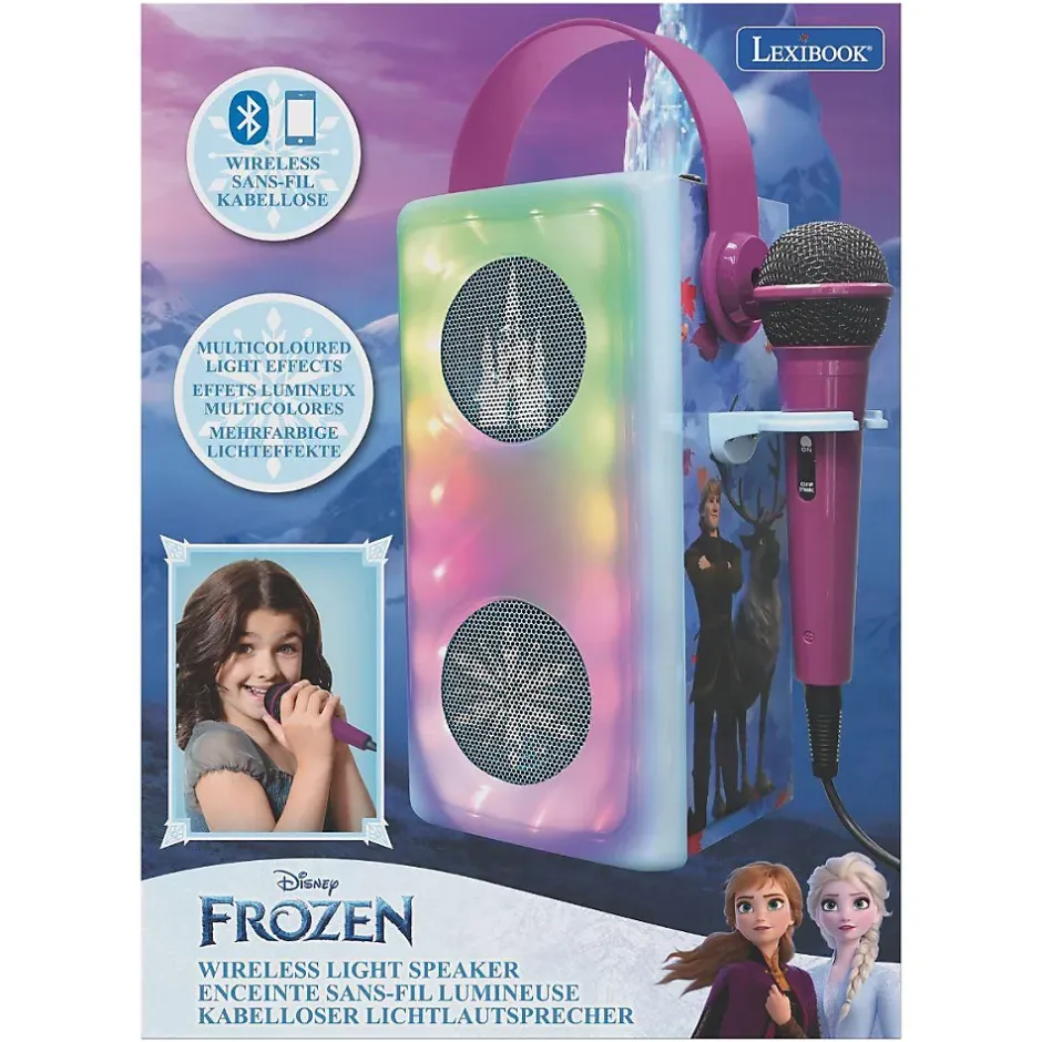 Magnifique Enceinte Bluetooth lumineuse avec micro La Reine des Neiges• 2 puissants haut-parleurs avec des effets lumineux multicolores • Fonctionne via Bluetooth mais également avec une carte SD/TF, une clé USB ou un câble Aux-in (câble inclus) • Micro inclus avec boutons de contrôle du volume et de l’écho• Batterie rechargeable via port USB type C (câble inclus)• Anse pour karaoké facile à transporter