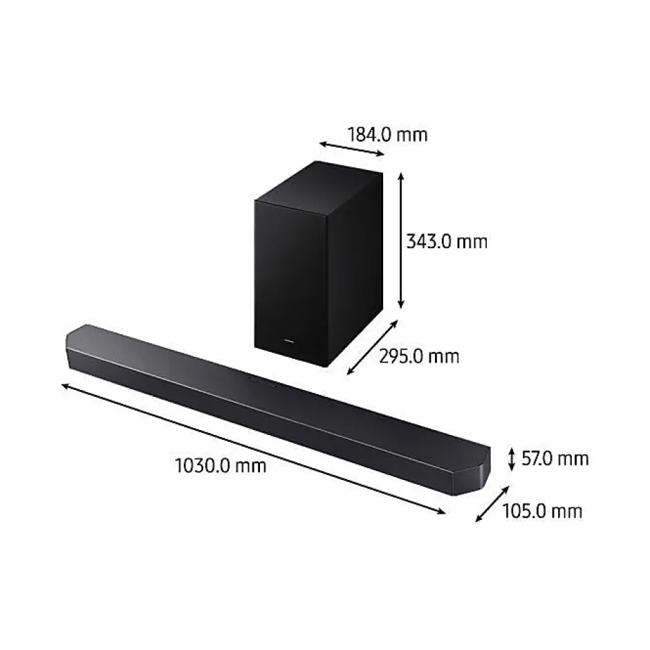 Caractéristiques du produitBarre de son 3.1.2 avec caisson de basses sans fil pour un rendu sonore profond et dynamique.9 haut-parleurs incluant un haut-parleur central et des haut-parleurs verticaux pour effets surround.Compatibilité Dolby Atmos et DTS Virtual:X pour une immersion audio tridimensionnelle.Connectivité avancée : HDMI eARC, HDMI-CEC, entrée optique, USB 2.0 et Bluetooth 4.2.Technologies audio : Q-Symphony, SpaceFit Sound Pro et Adaptive Sound pour optimisation automatique du son.Description détailléeDesign et dimensionsBarre de son compacte en noir titane mesurant 1030 x 57 x 105 mm (LxHxP) et poids de 3,9 kg ; caisson de basses sans fil 184 x 343 x 295 mm et 5,2 kg.Configuration et performancesSystème 3.1.2 avec 9 haut-parleurs offrant un son surround, dialogues clairs grâce au haut-parleur central et basses profondes via le caisson sans fil.Fonctions et modes audioModes sonores incluant Surround Sound expansion, Game Pro, Standard et Adaptive Sound ; prise en charge Dolby TrueHD, Dolby Digital Plus, DTS 5.1ch et DTS Virtual:X.Connectivité et contrôleInterfaces : 1x HDMI entrée, 1x HDMI sortie avec eARC, HDMI-CEC, USB 2.0, entrée optique et Bluetooth 4.2. Télécommande unique permettant de piloter la barre et le téléviseur.Options et accessoiresInclus : câble HDMI, accroche murale et télécommande. Enceintes arrières sans fil compatibles en option pour étendre l expérience surround.