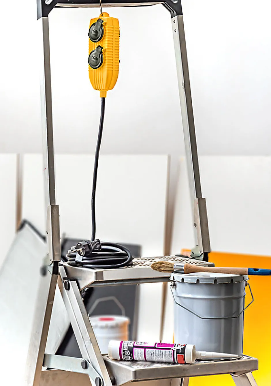 - Crochet rabattable intégré – permet de suspendre le bloc sur échafaudage ou échelle et de poser au sol.