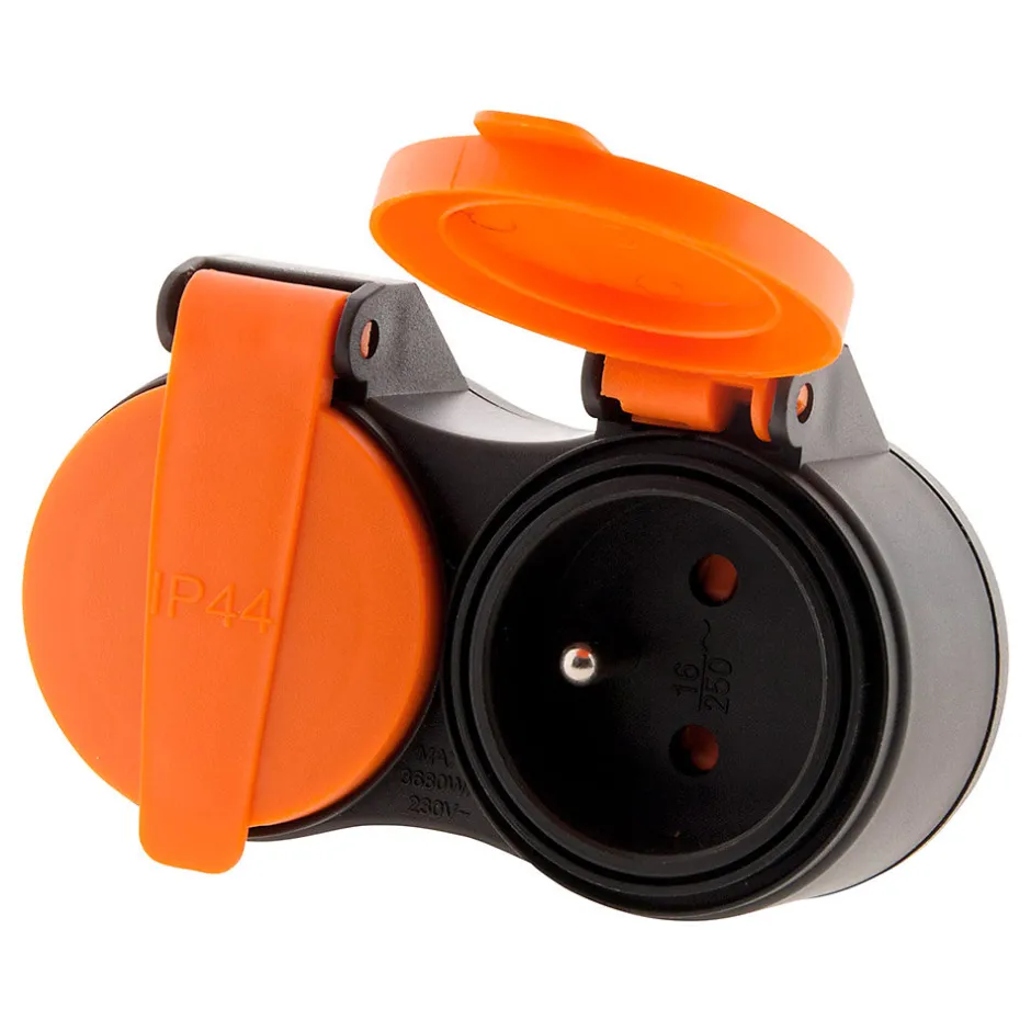 Rallonge extérieure 2 prises 2P+T. Couleur(s) : orange. Câble : H07RN-F 3×1,5 mm² haute résistance. Tension : 230 V. Indice de protection: IP44 contre projections d’eau et humidité. Avec clip de fixation. Utilisation : appareils électriques reliés à la terre. Pour nettoyeurs haute pression, pompes de piscine, éclairages extérieurs. Normes : conforme CE et NF