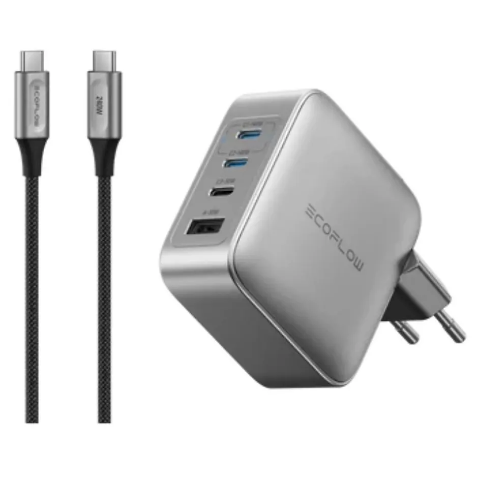 EcoFlow RAPID Pro Charger 140W – Chargeur GaN 4 ports, compact et puissantLe chargeur EcoFlow RAPID Pro 140W est une solution de recharge haut de gamme, conçue pour les utilisateurs mobiles et professionnels. Grâce à la technologie GaN, il offre une puissance élevée dans un format ultra-compact, 36 % plus petit qu’un chargeur Apple 140W.Avec ses 3 ports USB-C et 1 port USB-A, il permet de recharger jusqu’à 4 appareils simultanément, tout en ajustant intelligemment la puissance selon les besoins de chaque appareil. Il est compatible avec 99 % des appareils électroniques : MacBook, iPhone, iPad, Samsung Galaxy, Dell XPS, consoles, montres connectées, etc.Sa conception ignifuge (V0), sa résistance aux chutes (jusqu’à 1 m) et sa durabilité (5 000 cycles de branchement) en font un chargeur fiable et sécurisé. Il prend en charge les protocoles PPS, PD3.1, QC3.0, SCP, FCP, Apple 2.4A, garantissant une recharge rapide et stable.Compact, léger et doté de broches pliables, il est idéal pour les déplacements quotidiens ou les voyages d’affaires. Pour une performance optimale, utilisez un câble USB-C PD3.1 avec puce E-Marker (non inclus).Technologie : GaN (nitrure de gallium)Puissance de sortie totale : 140 W maxPorts :USB-C1 / USB-C2 : jusqu’à 140 W (28V⎓5A)USB-C3 : jusqu’à 30 WUSB-A : jusqu’à 30 WConfigurations de sortie :USB-C1 + USB-C2 : 70 W + 70 WUSB-C3 + USB-A : 18 WUSB-C1/C2 + USB-C3 : 100 W + 30 WUSB-C1 + USB-C2 + USB-C3 : 65 W + 45 W + 30 WUSB-C1 + USB-C2 + USB-A : 65 W + 45 W + 18 WUSB-C1/C2 + (USB-C3 + USB-A) : 65 W + 45 W + 18 WCompatibilité : ordinateurs portables, smartphones, tablettes, montres, consolesProtocoles pris en charge : PPS, PD3.1, PD3.0, QC3.0, QC2.0, FCP, SCP, Apple 2.4A, BC1