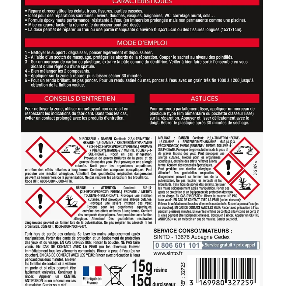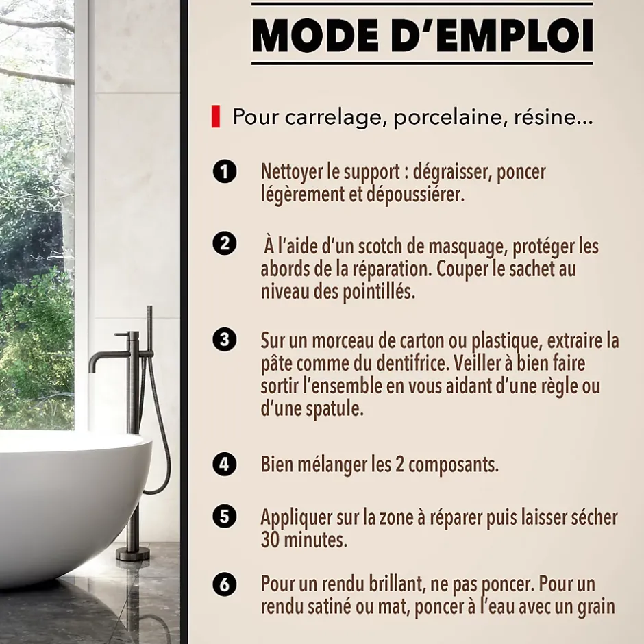 - Idéal pour des réparations des sanitaires. Il est conçu pour réparer éviers, douches, vasques, baignoires, WC, carrelage mural, sols… Il s’applique sur carrelage, porcelaine, résine, acrylique, pierre, quartz, granit, grès…